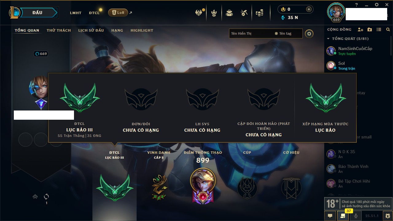 Rank Đơn: Bạc IIIKhung: BạcTướng: 172 - Còn 7386 THXTrang Phục: 109Rank ĐTCL: Lục Bảo IIILinh Thú: 37
