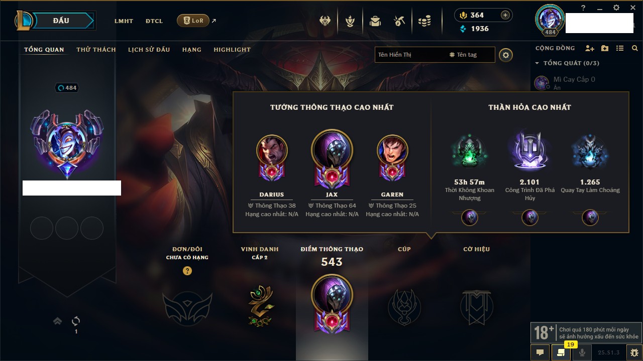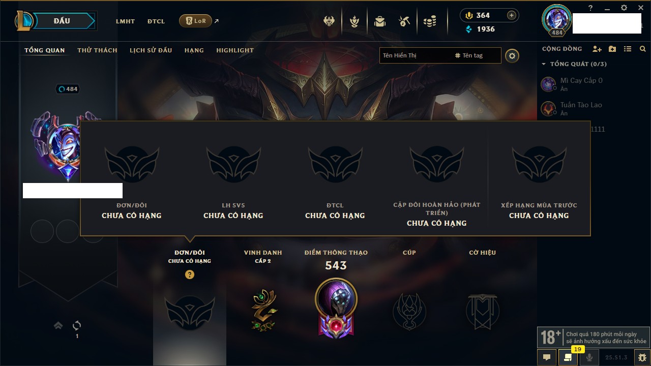 Rank Đơn: Vàng IKhung: Bạch kimTướng: 172 - Còn 108407 THXTrang Phục: 237Rank ĐTCL: Chưa RankLinh Thú: 44