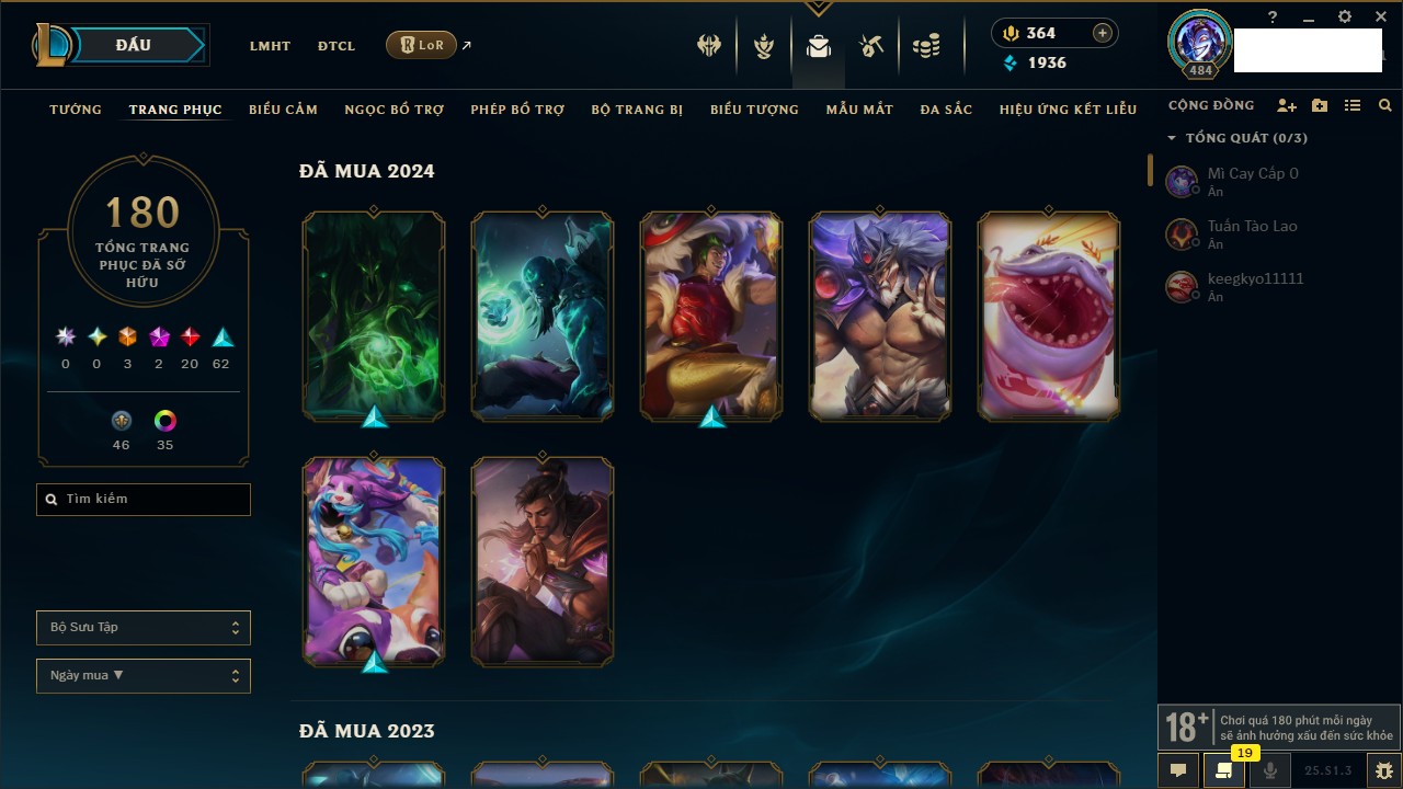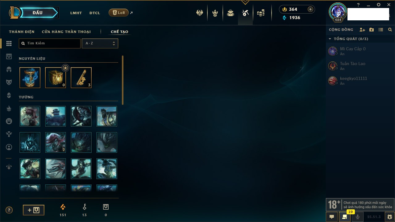 Rank Đơn: Vàng IIKhung: VàngTướng: 171 - Còn 34018 THXTrang Phục: 250Rank ĐTCL: Sắt IILinh Thú: 19