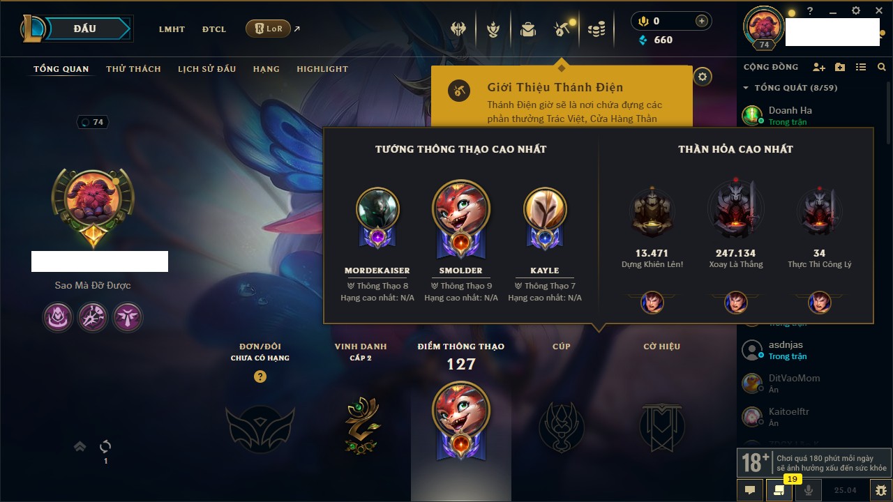 Rank Đơn: Bạch Kim IIKhung: Bạch kimTướng: 171 - Còn 316137 THXTrang Phục: 89Rank ĐTCL: Bạch Kim IIILinh Thú: 94