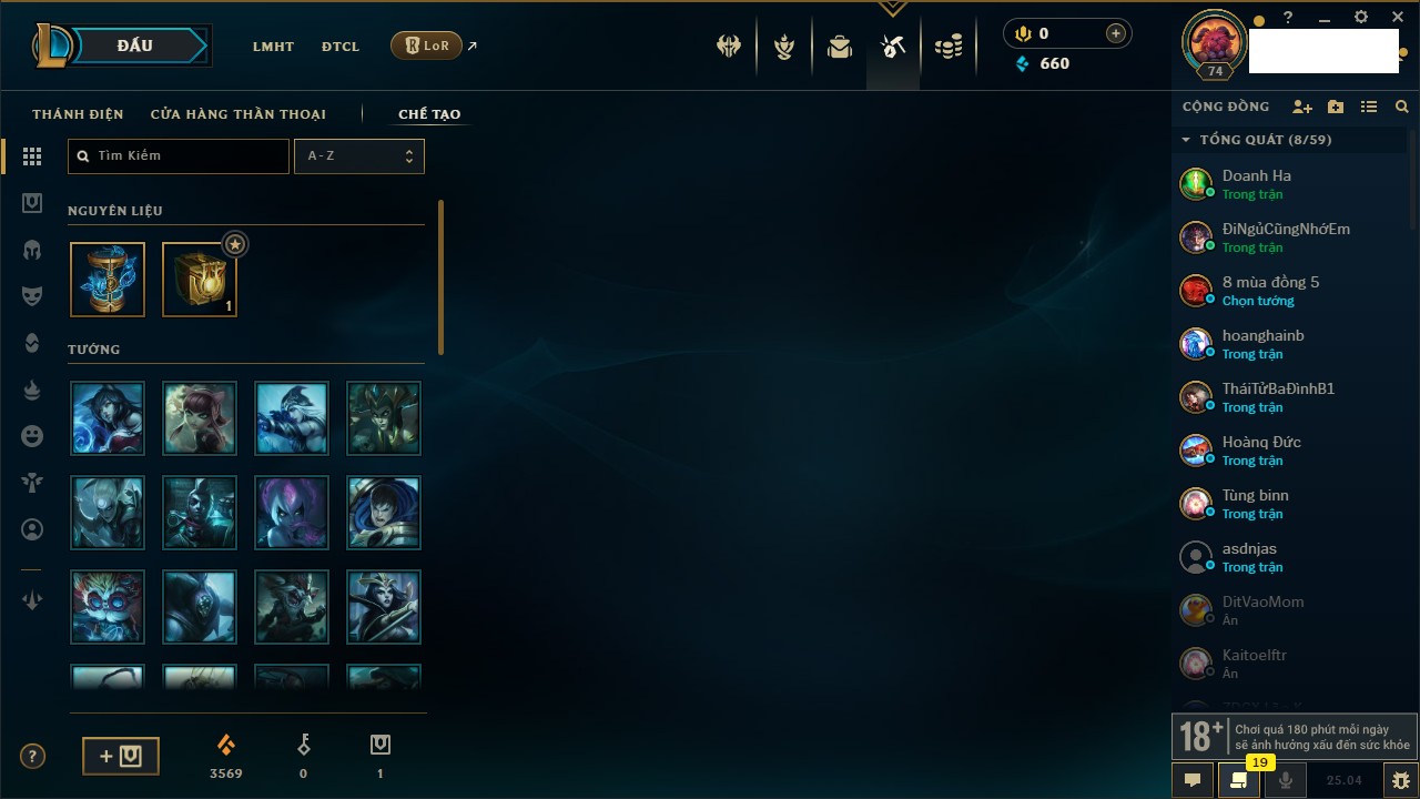 Rank Đơn: Lục Bảo IVKhung: VàngTướng: 171 - Còn 154648 THXTrang Phục: 203Rank ĐTCL: Bạch Kim IVLinh Thú: 69