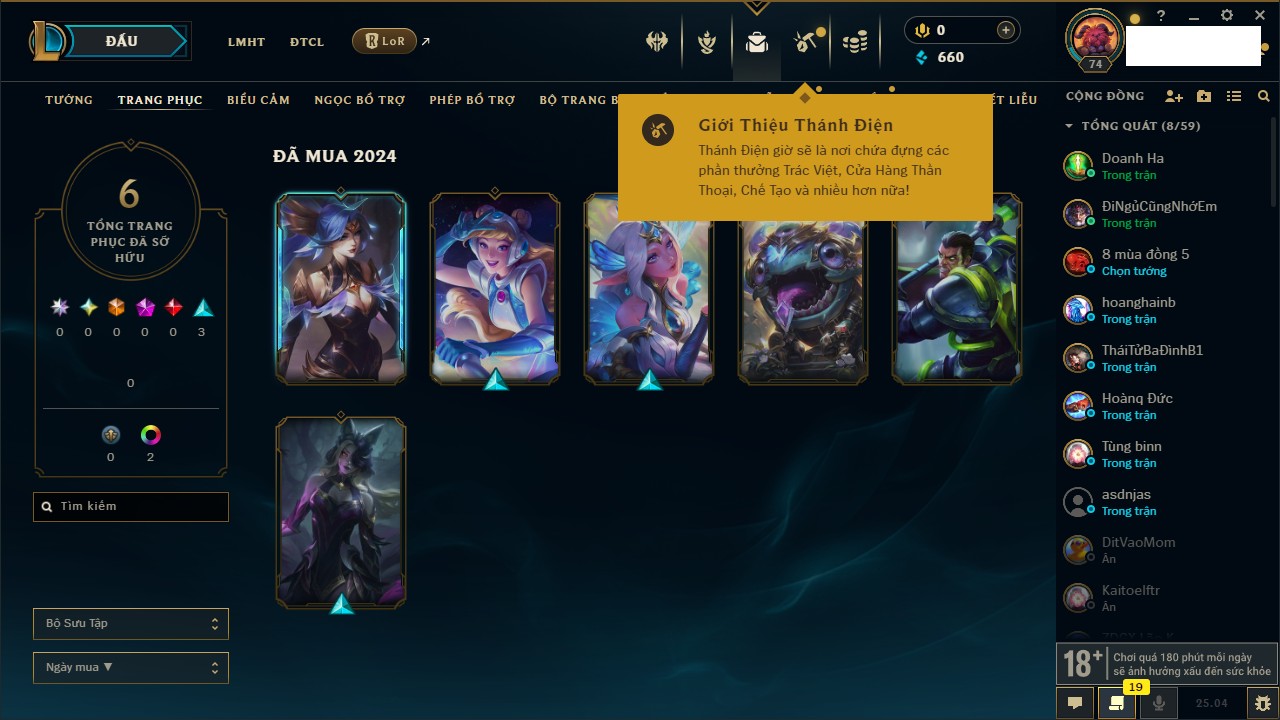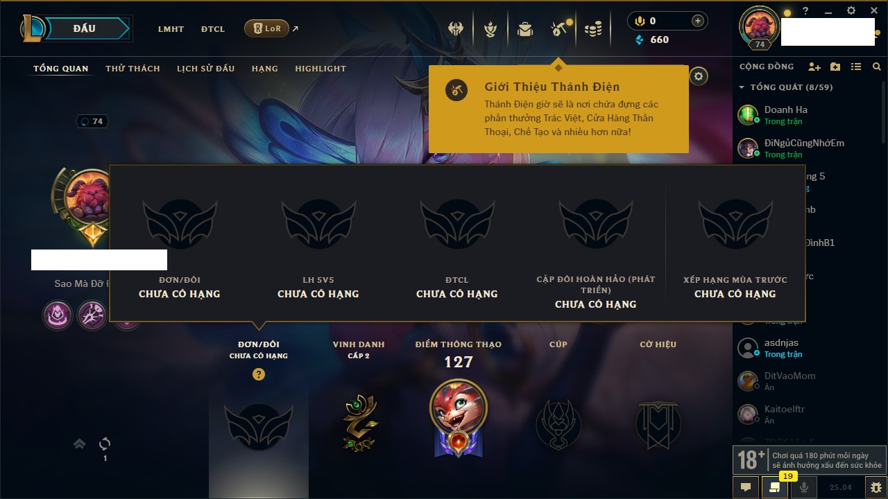 Rank Đơn: Vàng IIIKhung: VàngTướng: 172 - Còn 164704 THXTrang Phục: 255Rank ĐTCL: Kim Cương IVLinh Thú: 156