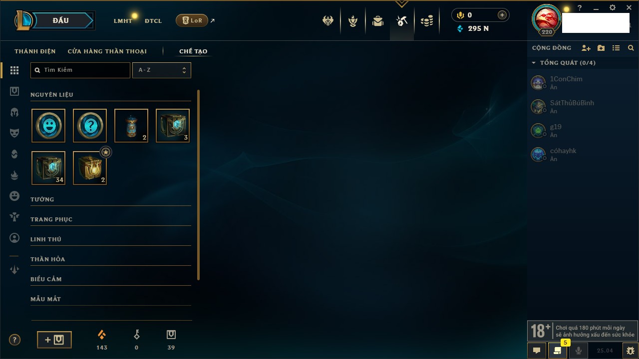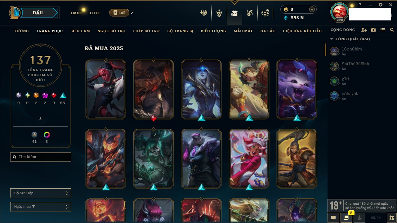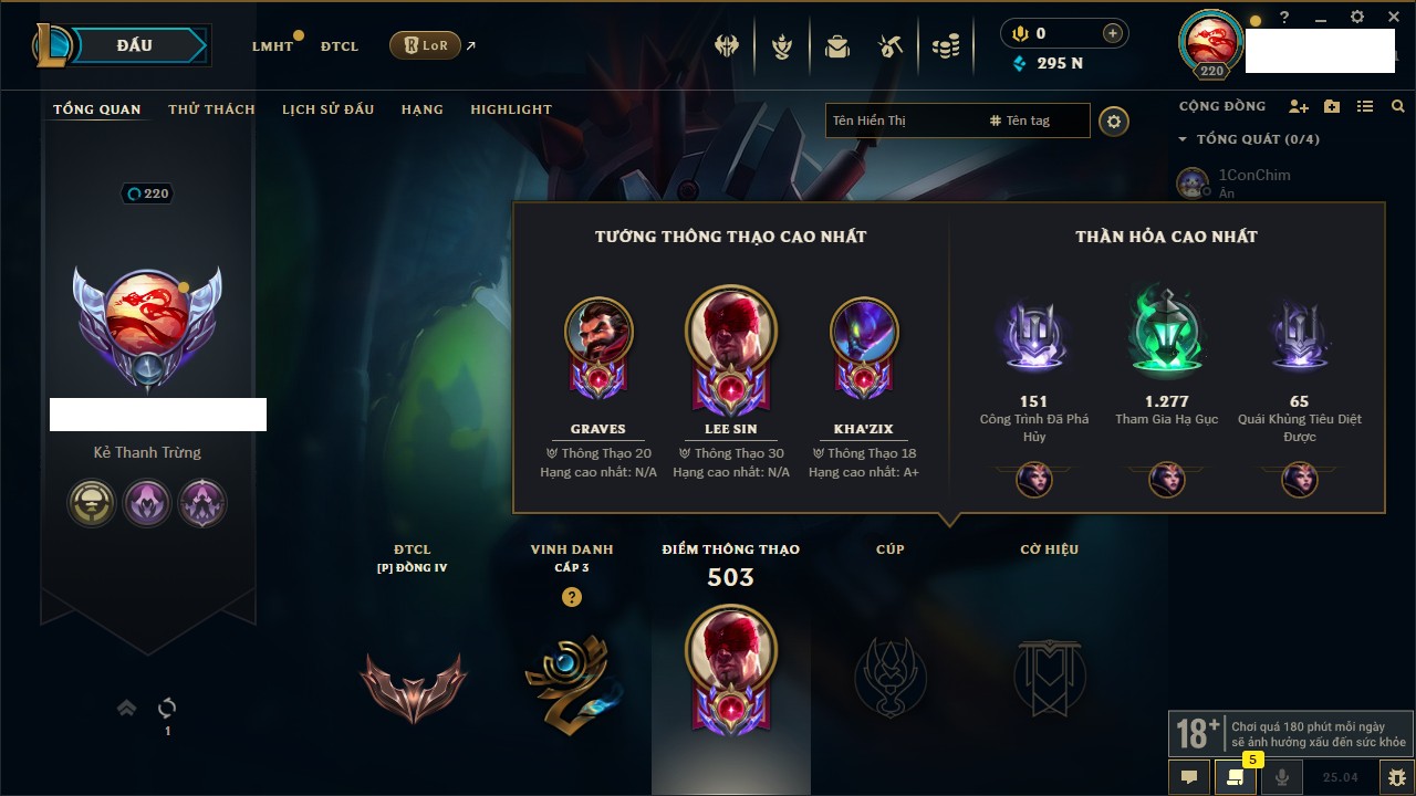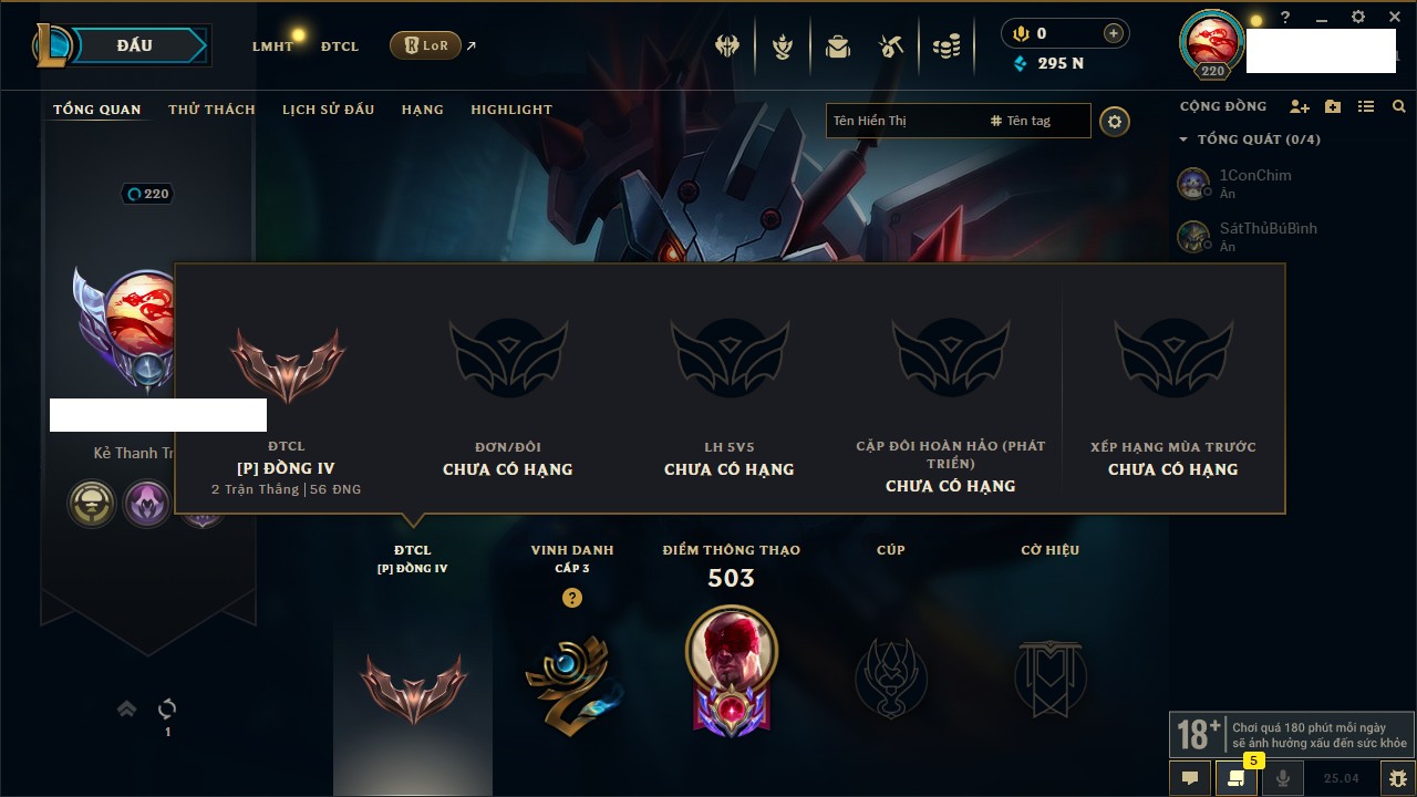 Rank Đơn: Đồng IIKhung: Chưa có khungTướng: 153 - Còn 32832 THXTrang Phục: 66Rank ĐTCL: Chưa RankLinh Thú: 7