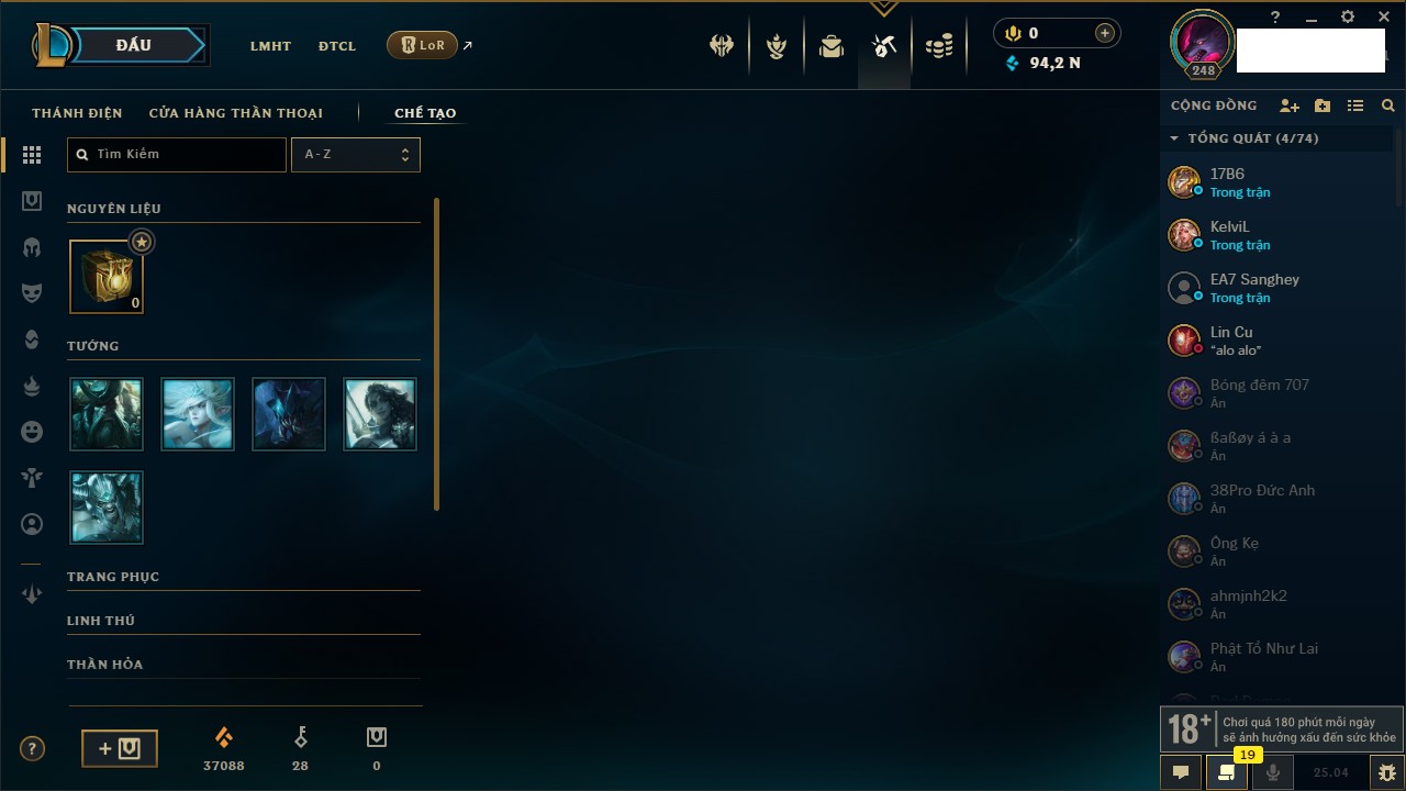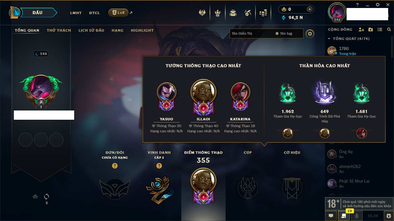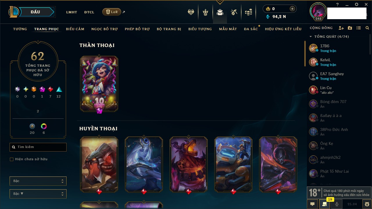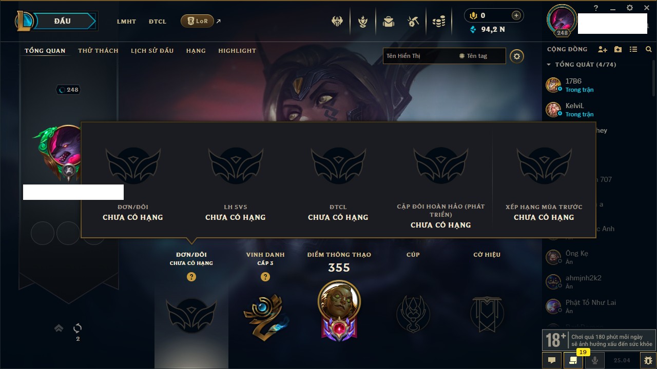 Rank Đơn: Đồng IIIKhung: Chưa có khungTướng: 165 - Còn 26276 THXTrang Phục: 61Rank ĐTCL: Chưa RankLinh Thú: 32