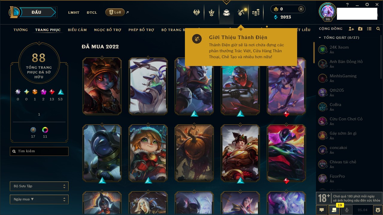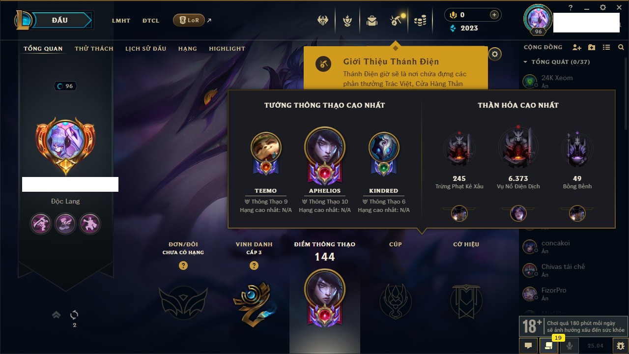 Rank Đơn: Đồng IIKhung: Chưa có khungTướng: 170 - Còn 2078 THXTrang Phục: 72Rank ĐTCL: Đồng ILinh Thú: 133