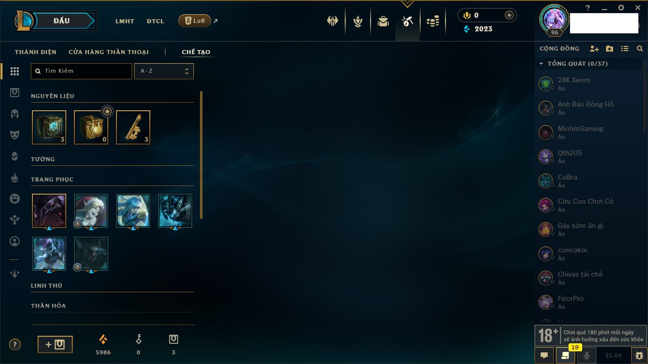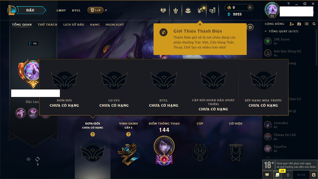 Rank Đơn: Lục Bảo IVKhung: VàngTướng: 171 - Còn 154648 THXTrang Phục: 203Rank ĐTCL: Bạch Kim IVLinh Thú: 69