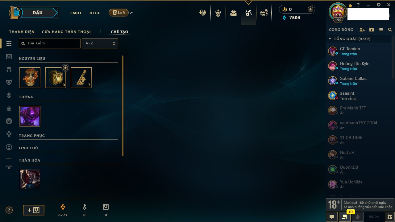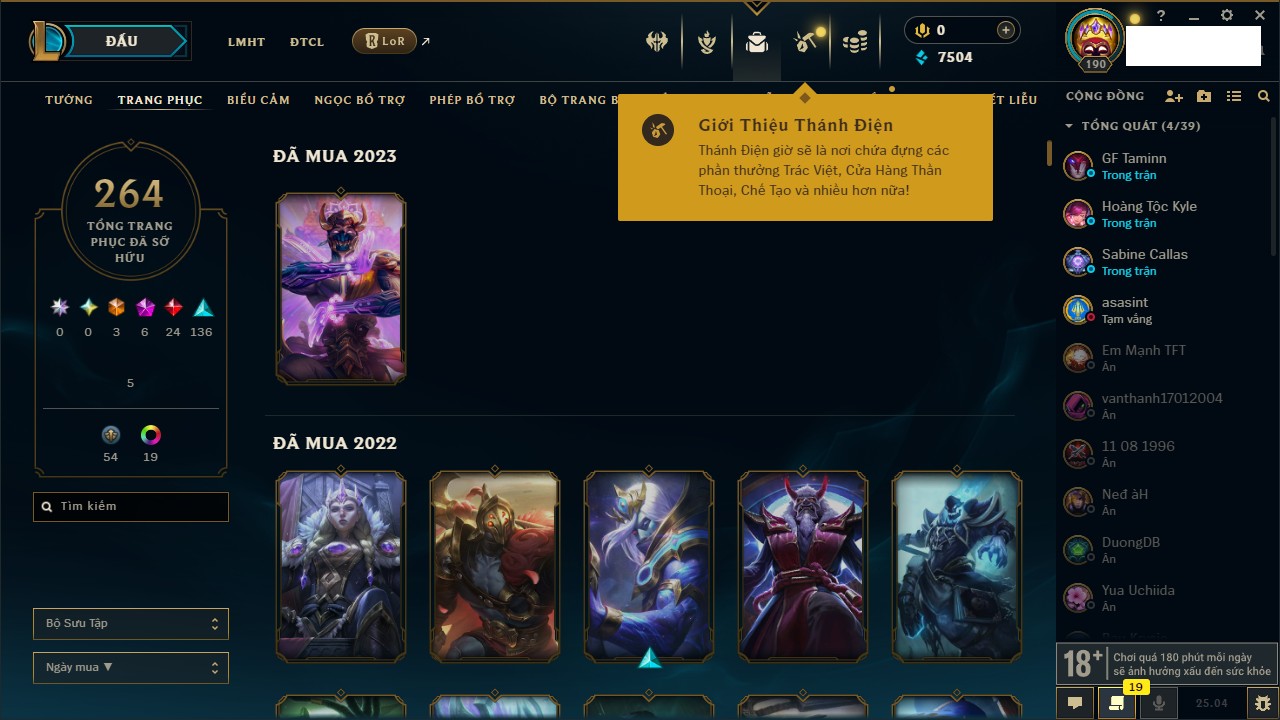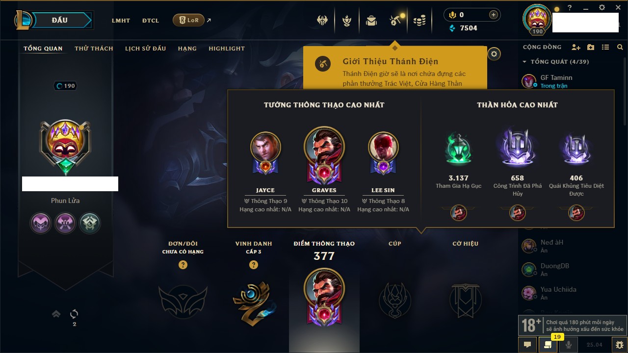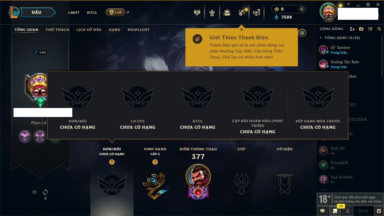 Rank Đơn: Chưa RankKhung: VàngTướng: 171 - Còn 660284 THXTrang Phục: 199Rank ĐTCL: Chưa RankLinh Thú: 34