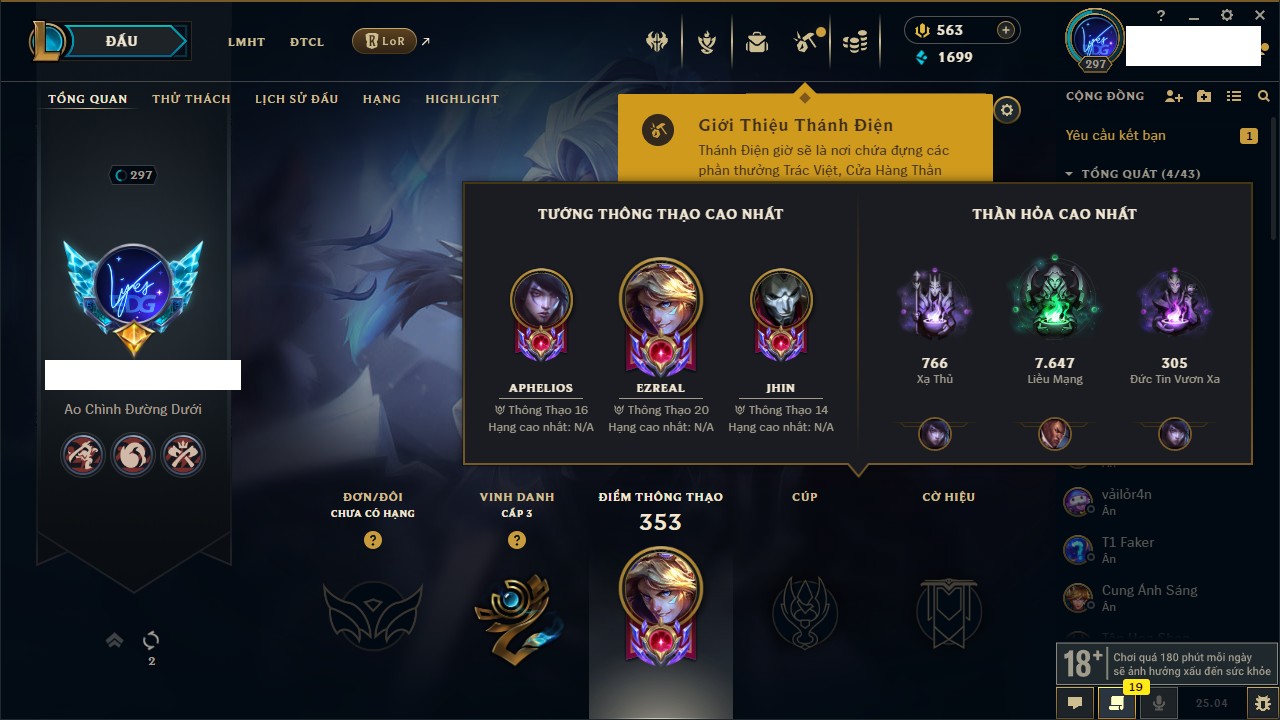 Rank Đơn: Vàng IKhung: Bạch kimTướng: 170 - Còn 212450 THXTrang Phục: 214Rank ĐTCL: Bạch Kim IVLinh Thú: 221