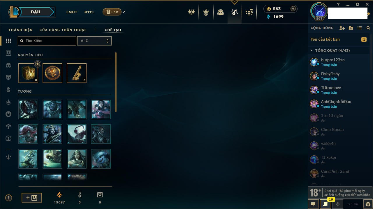 Rank Đơn: Bạch Kim IVKhung: Bạch kimTướng: 171 - Còn 182788 THXTrang Phục: 158Rank ĐTCL: Lục Bảo IVLinh Thú: 56