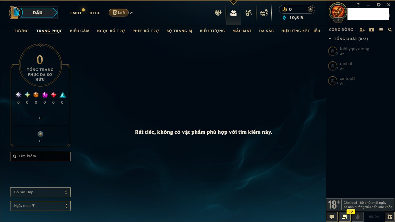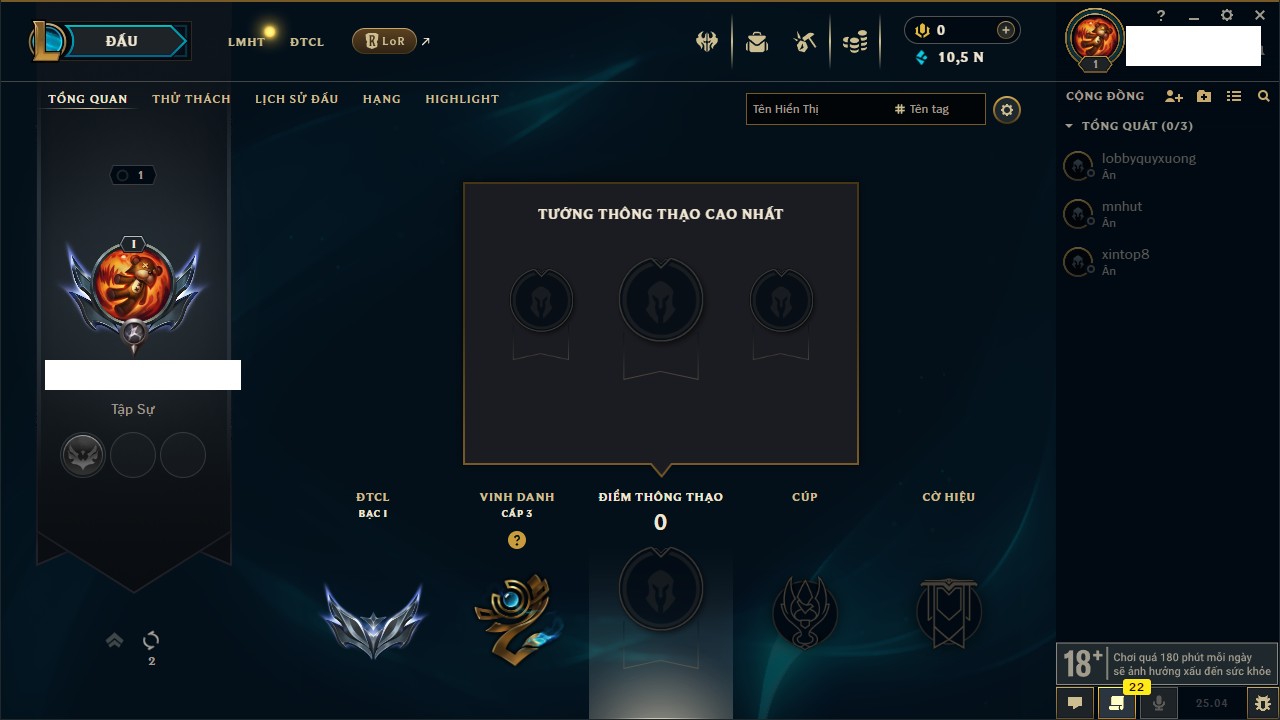 Rank Đơn: Đồng IIIKhung: ĐồngTướng: 170 - Còn 48082 THXTrang Phục: 272Rank ĐTCL: Chưa RankLinh Thú: 84