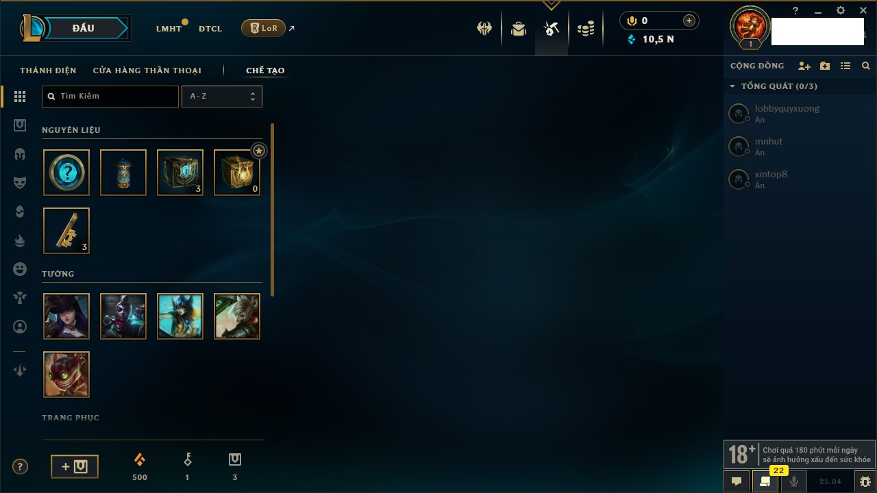Rank Đơn: Bạch Kim IIIKhung: Bạch kimTướng: 170 - Còn 61079 THXTrang Phục: 352Rank ĐTCL: Sắt IILinh Thú: 70