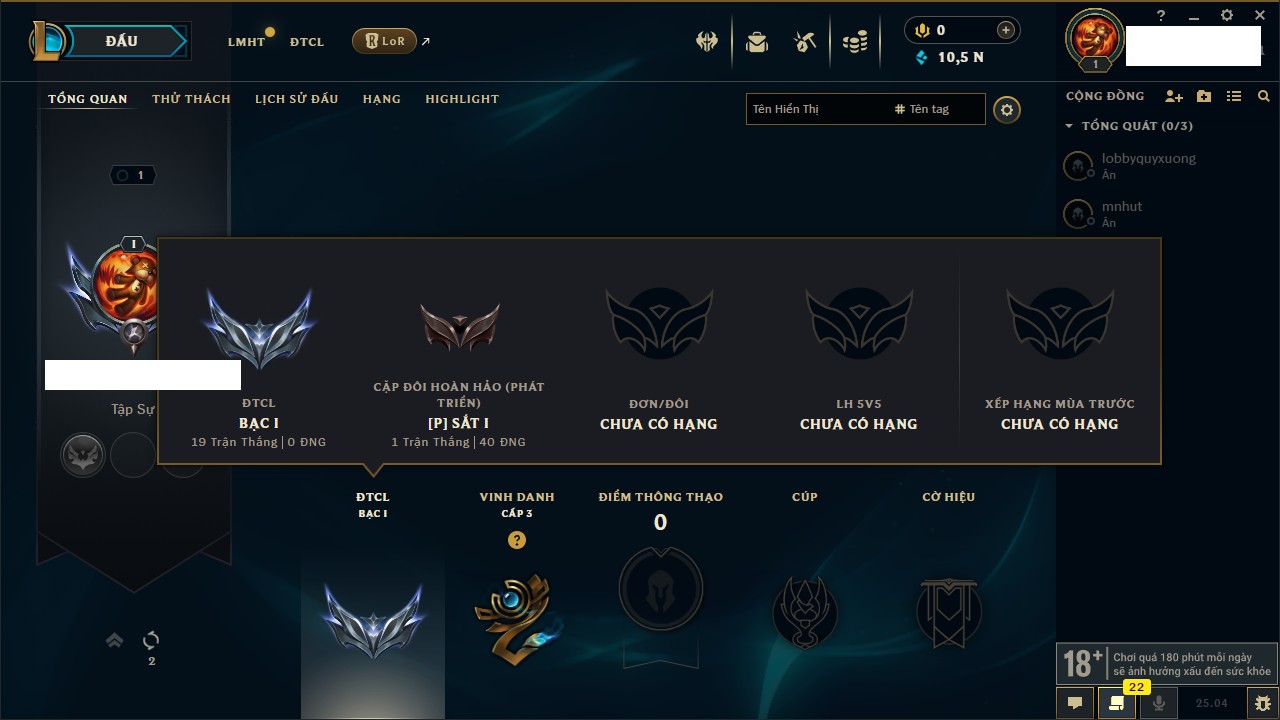 Rank Đơn: Vàng IKhung: Bạch kimTướng: 170 - Còn 212450 THXTrang Phục: 214Rank ĐTCL: Bạch Kim IVLinh Thú: 221