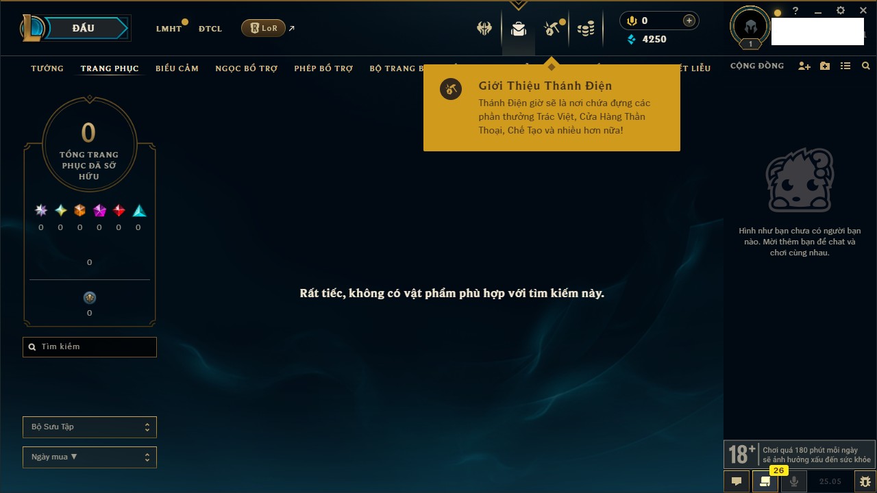 Rank Đơn: Đồng IKhung: ĐồngTướng: 168 - Còn 11447 THXTrang Phục: 245Rank ĐTCL: Chưa RankLinh Thú: 53