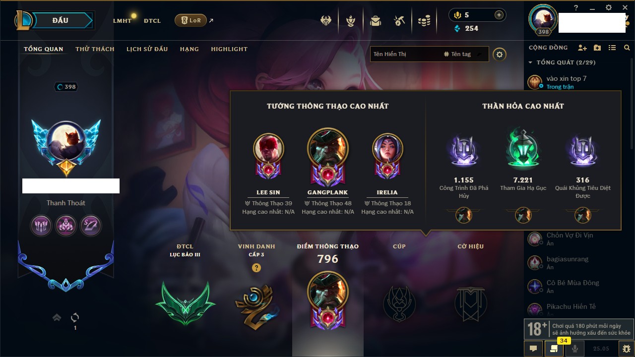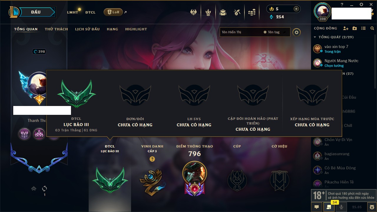Rank Đơn: Vàng IKhung: BạcTướng: 171 - Còn 60584 THXTrang Phục: 286Rank ĐTCL: Vàng IIILinh Thú: 117