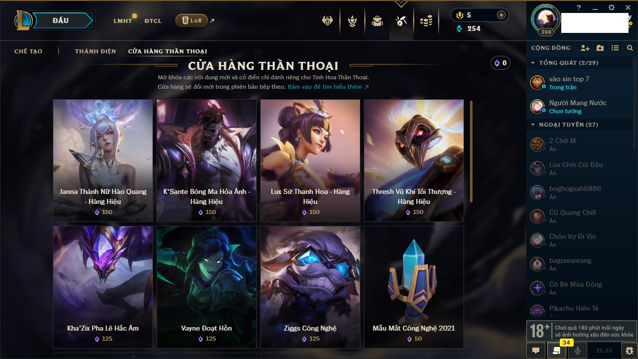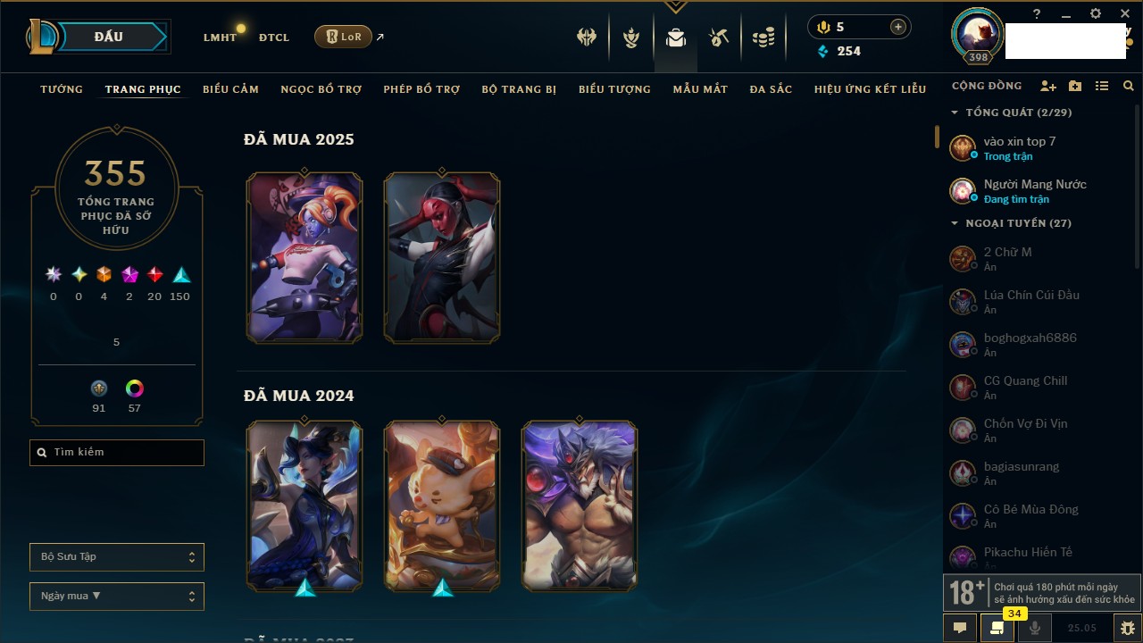 Rank Đơn: Vàng IIIKhung: VàngTướng: 171 - Còn 88128 THXTrang Phục: 329Rank ĐTCL: Chưa RankLinh Thú: 41