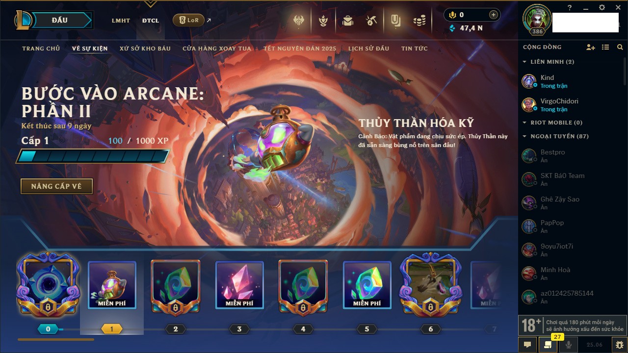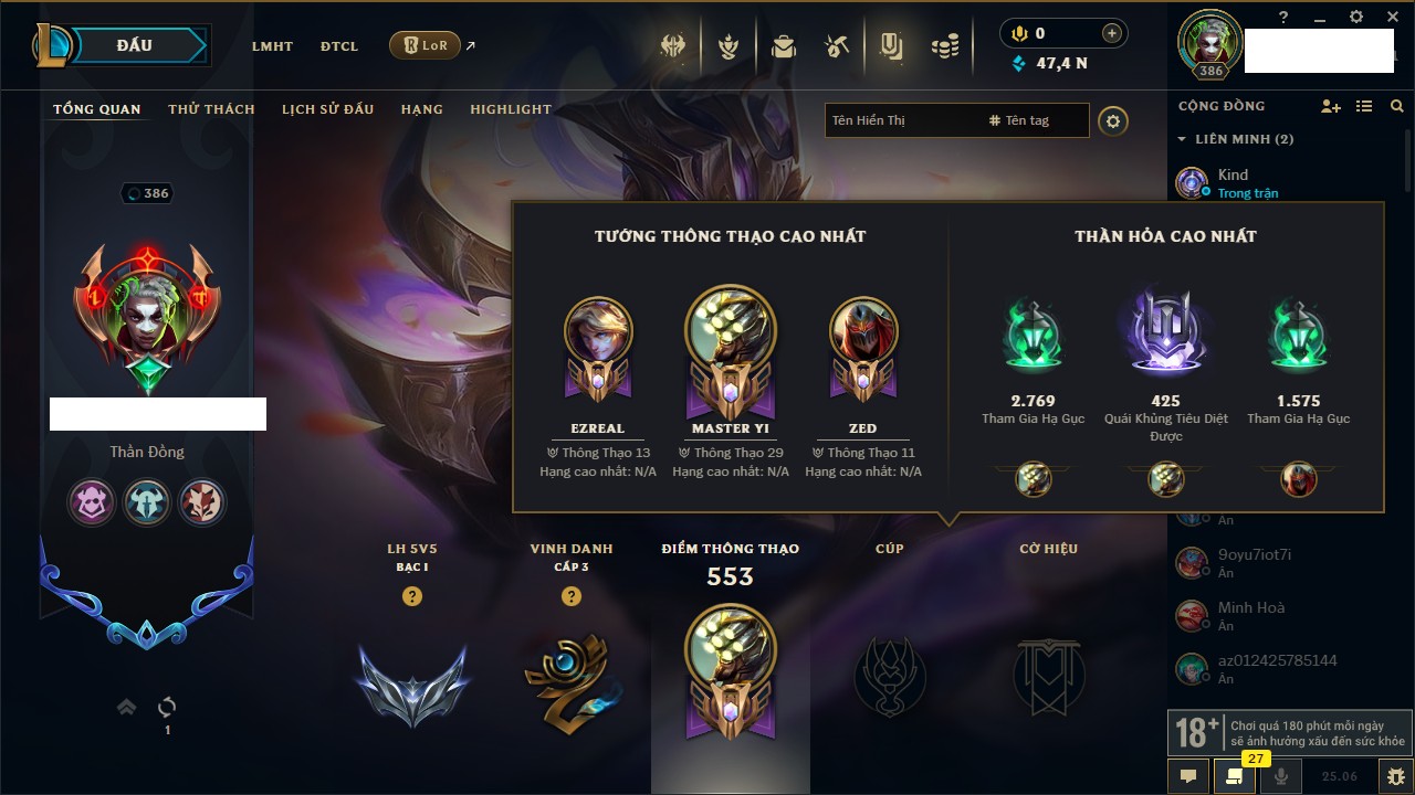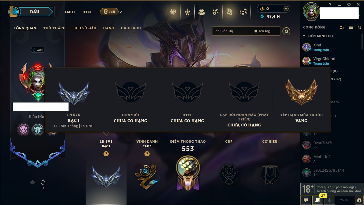 Rank Đơn: Bạc IIIKhung: BạcTướng: 171 - Còn 51045 THXTrang Phục: 220Rank ĐTCL: Sắt IILinh Thú: 141