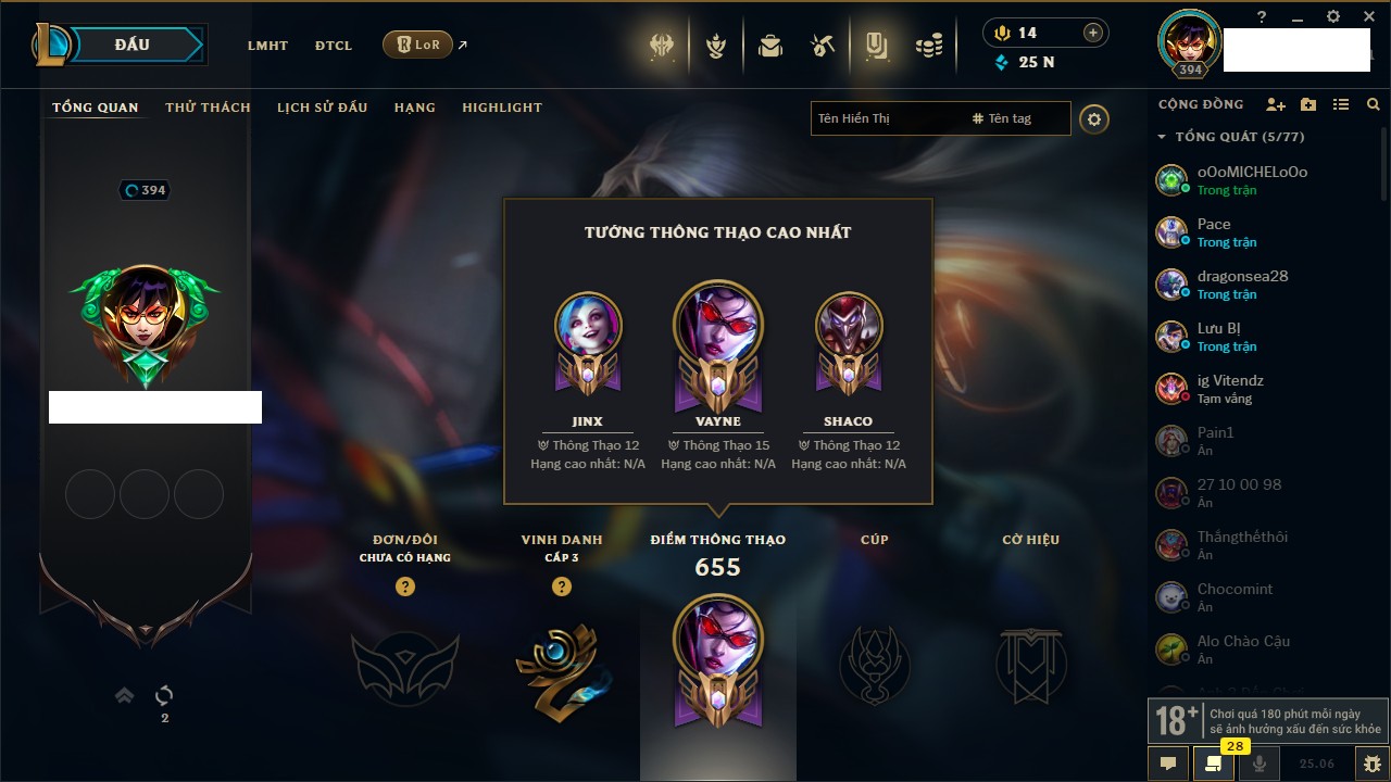Rank Đơn: Vàng IVKhung: BạcTướng: 166 - Còn 180925 THXTrang Phục: 163Rank ĐTCL: Chưa RankLinh Thú: 67