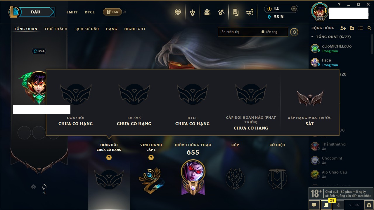 Rank Đơn: Sắt IKhung: SắtTướng: 171 - Còn 125789 THXTrang Phục: 151Rank ĐTCL: Đồng IIILinh Thú: 72