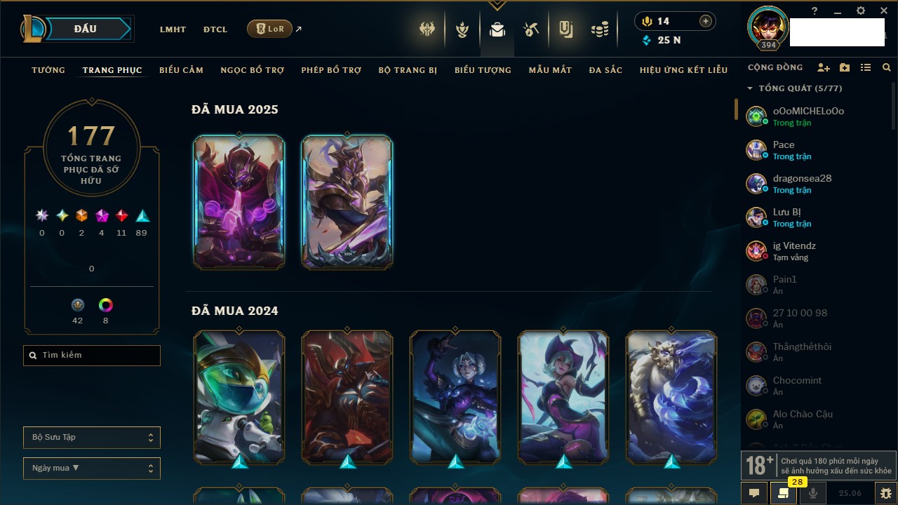 Rank Đơn: Vàng IVKhung: VàngTướng: 171 - Còn 48721 THXTrang Phục: 171Rank ĐTCL: Chưa RankLinh Thú: 27