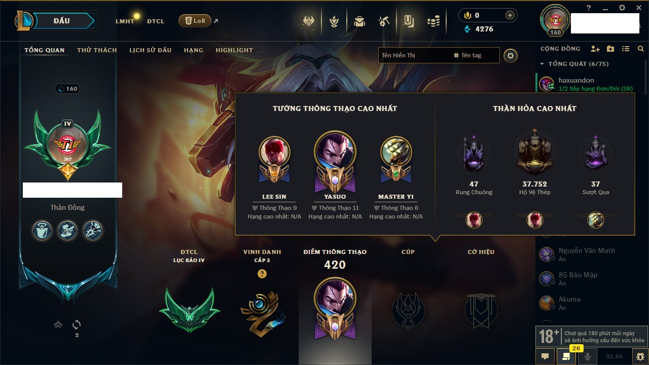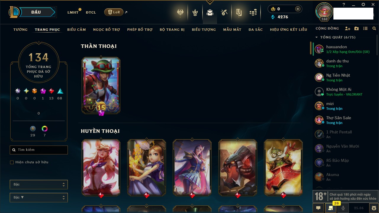 Rank Đơn: Đồng IIKhung: Chưa có khungTướng: 170 - Còn 56487 THXTrang Phục: 90Rank ĐTCL: Chưa RankLinh Thú: 129