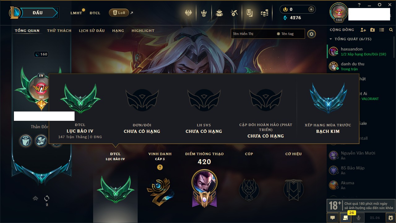 Rank Đơn: Vàng IVKhung: VàngTướng: 146 - Còn 89110 THXTrang Phục: 63Rank ĐTCL: Vàng IIILinh Thú: 41