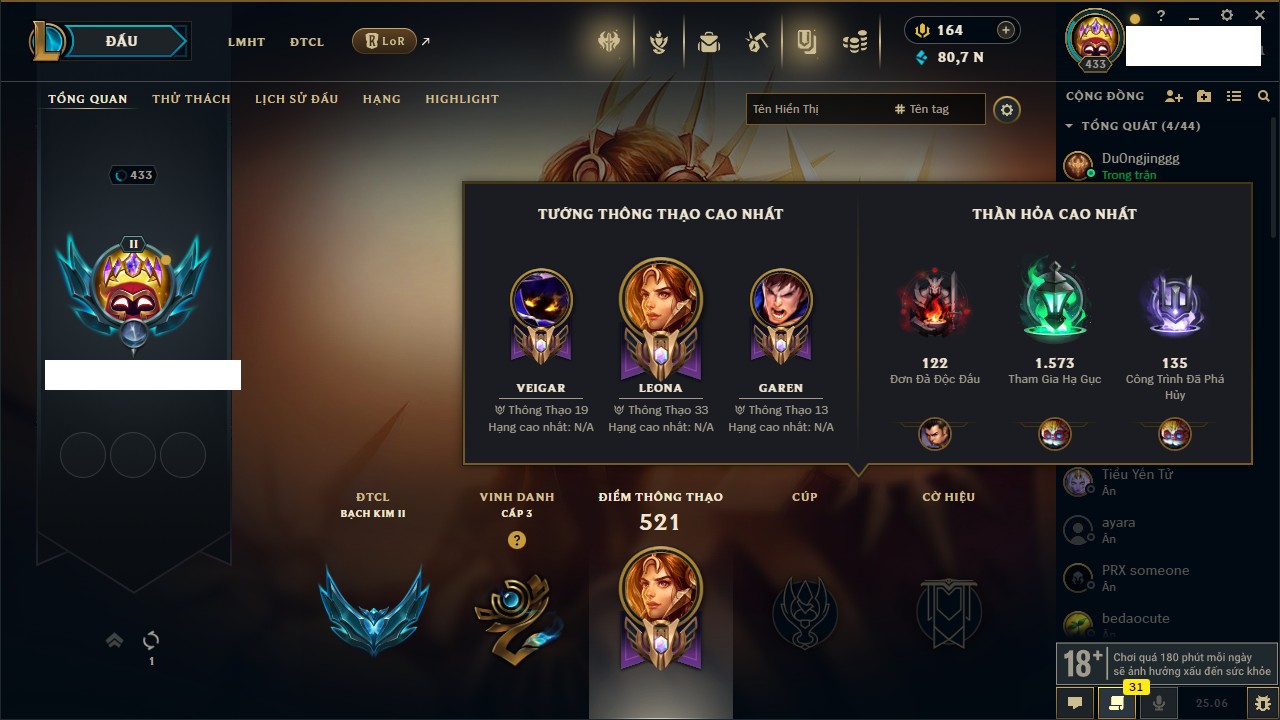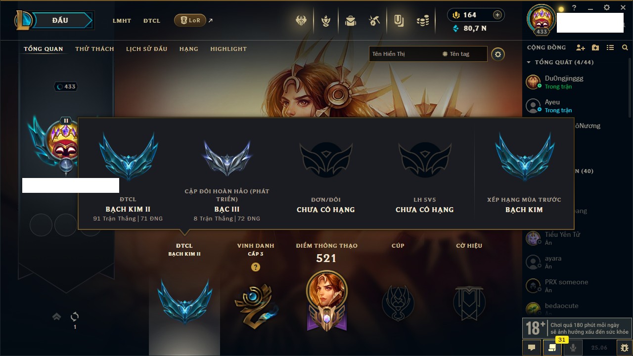 Rank Đơn: Đồng IIKhung: Chưa có khungTướng: 170 - Còn 56487 THXTrang Phục: 90Rank ĐTCL: Chưa RankLinh Thú: 129