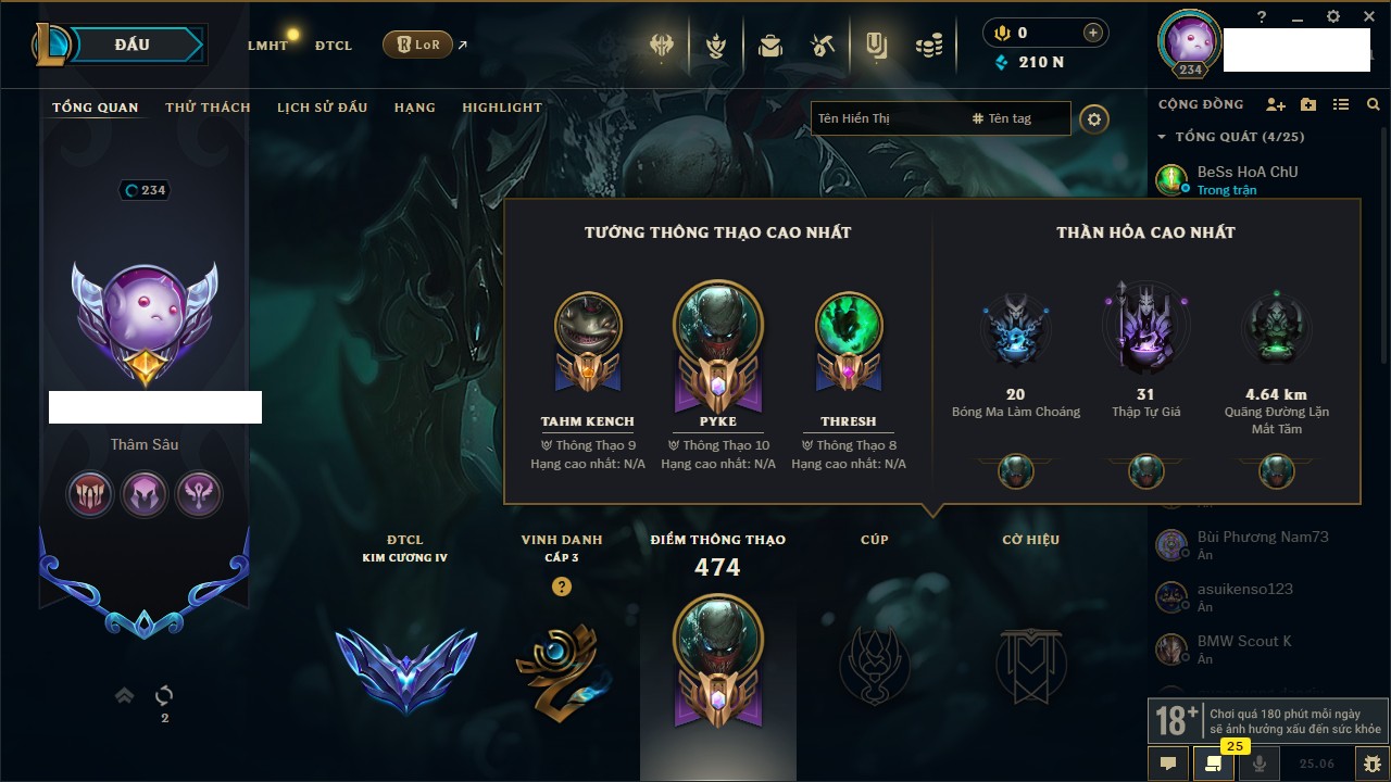 Rank Đơn: Bạc IIIKhung: Chưa có khungTướng: 163 - Còn 66843 THXTrang Phục: 182Rank ĐTCL: Kim Cương IVLinh Thú: 114