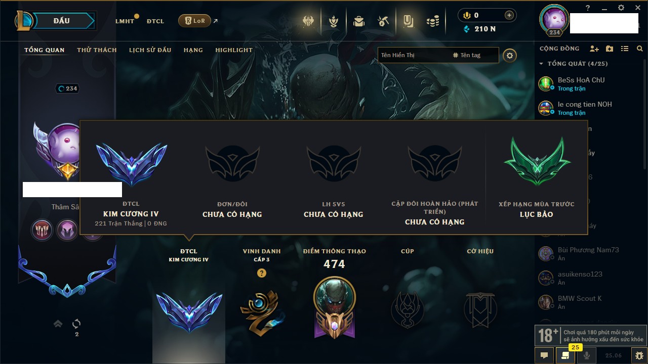 Rank Đơn: Vàng IIIKhung: BạcTướng: 171 - Còn 101359 THXTrang Phục: 88Rank ĐTCL: Kim Cương IVLinh Thú: 200