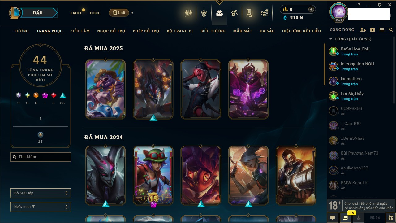 Rank Đơn: Vàng IVKhung: VàngTướng: 171 - Còn 56632 THXTrang Phục: 215Rank ĐTCL: Bạc ILinh Thú: 71