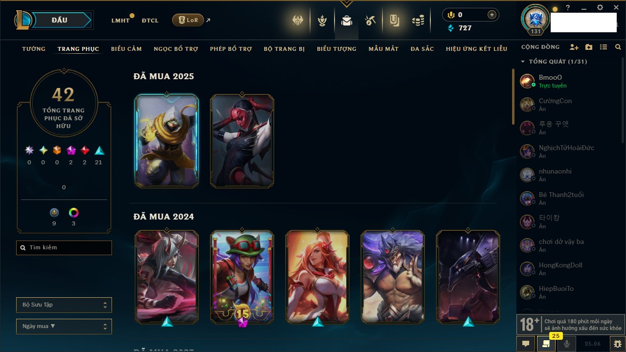 Rank Đơn: Vàng IIKhung: VàngTướng: 170 - Còn 243330 THXTrang Phục: 230Rank ĐTCL: Chưa RankLinh Thú: 68