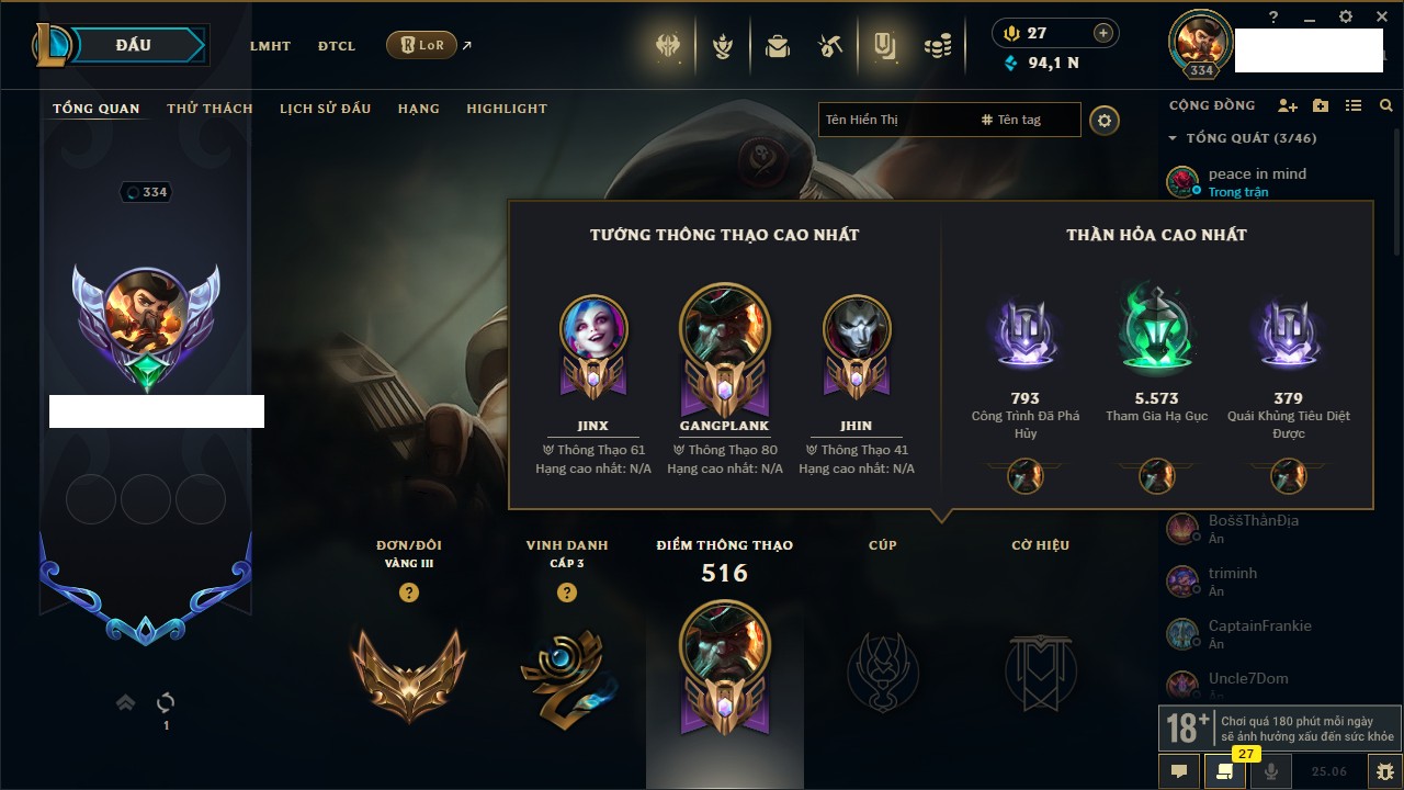 Rank Đơn: Chưa RankKhung: Chưa có khungTướng: 171 - Còn 75227 THXTrang Phục: 425Rank ĐTCL: Chưa RankLinh Thú: 201