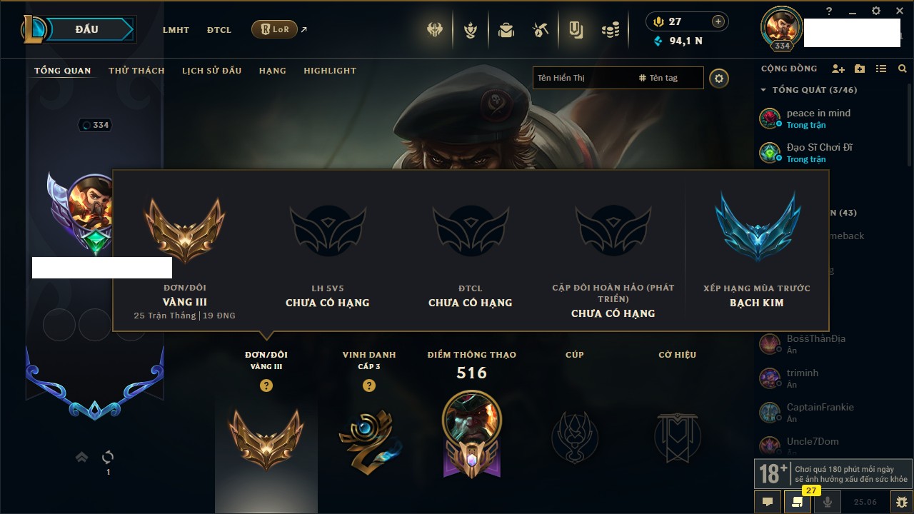 Rank Đơn: Chưa RankKhung: Chưa có khungTướng: 160 - Còn 21398 THXTrang Phục: 380Rank ĐTCL: Chưa RankLinh Thú: 27