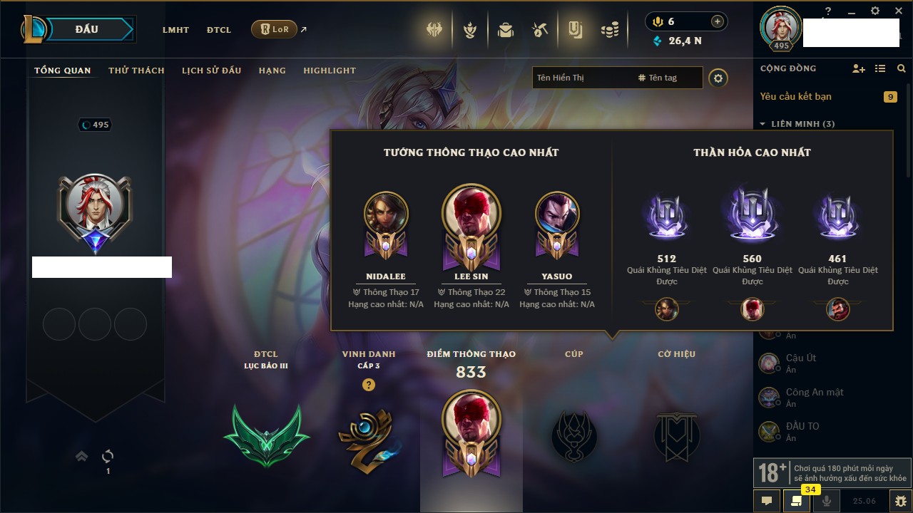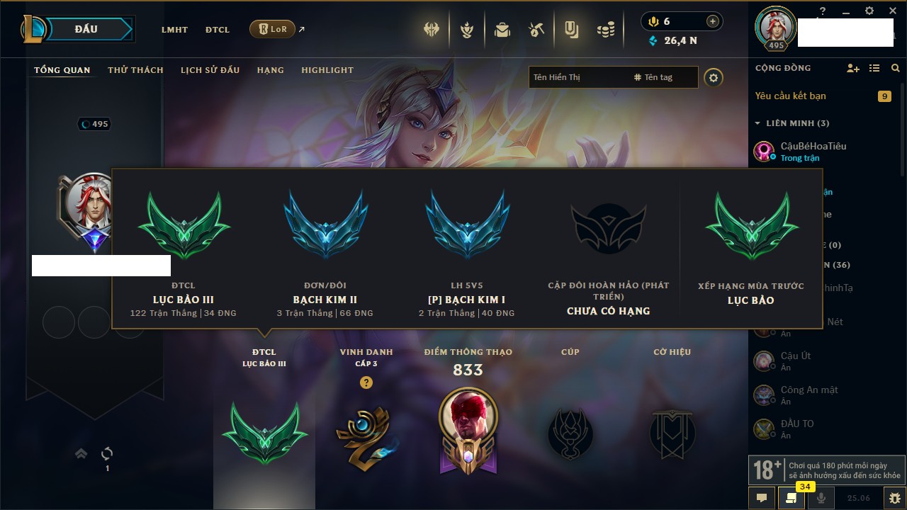 Rank Đơn: Vàng IKhung: BạcTướng: 171 - Còn 60584 THXTrang Phục: 286Rank ĐTCL: Vàng IIILinh Thú: 117