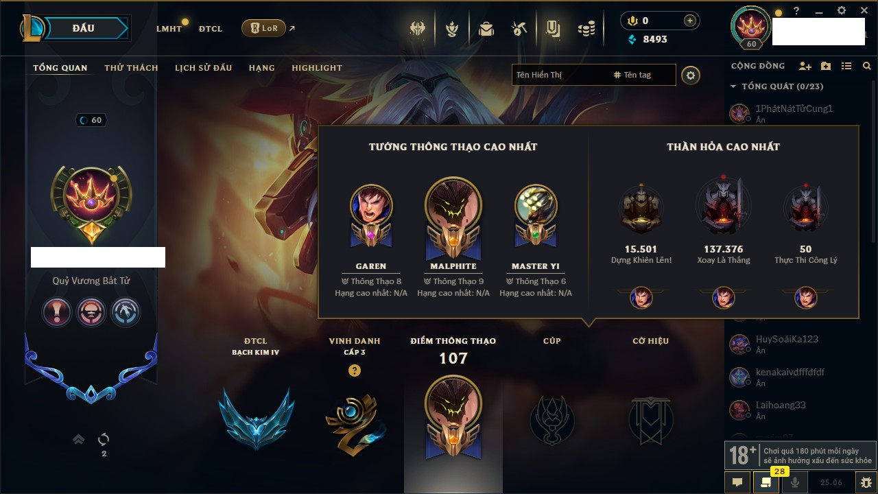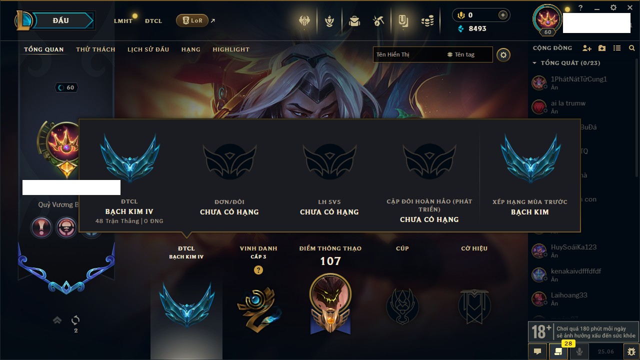 Rank Đơn: Chưa rank mùa nàoKhung: Chưa có khungTướng: 0 - Còn 0 THXTrang Phục: 0Rank ĐTCL: Chưa RankLinh Thú: 11