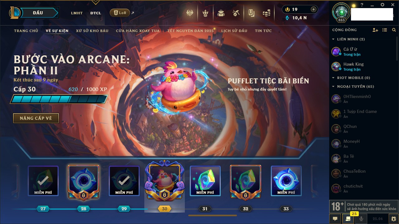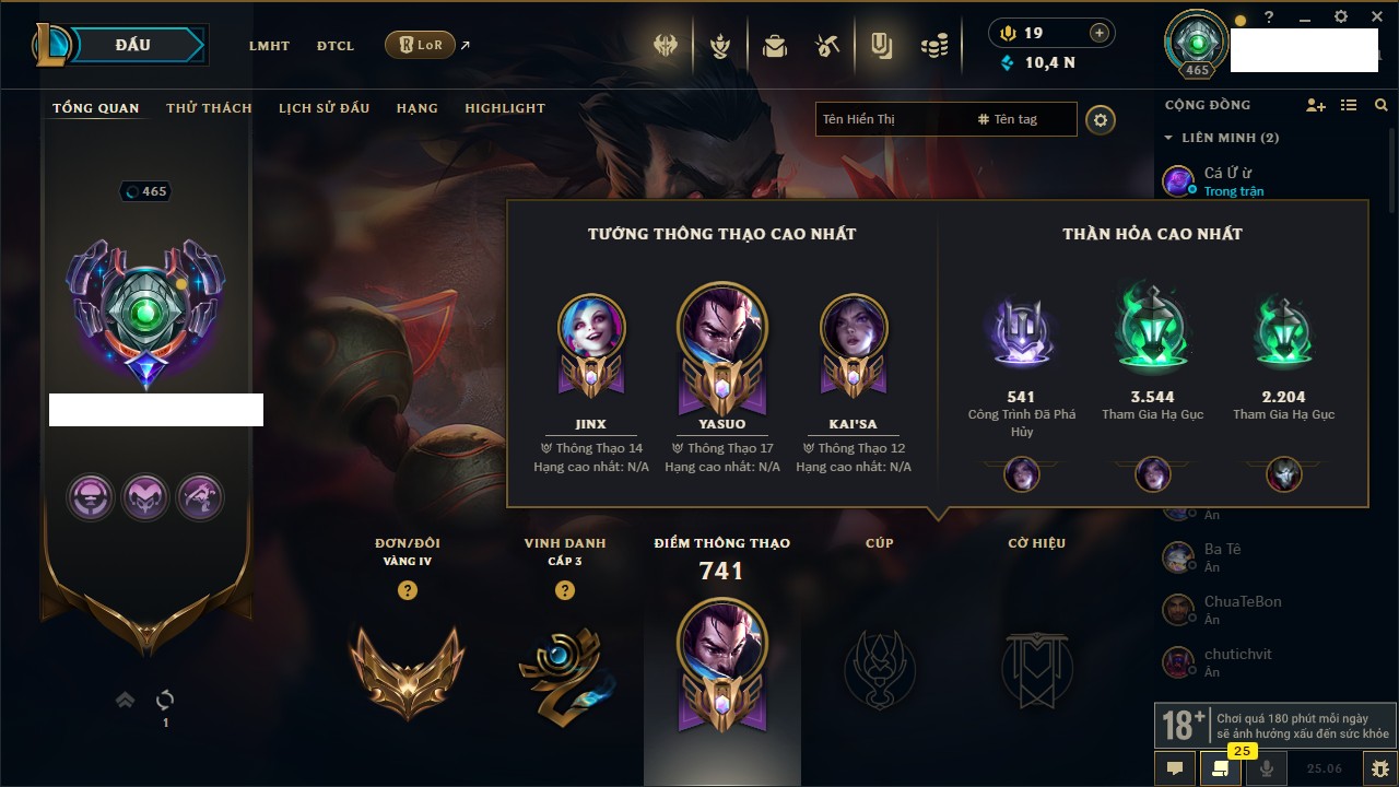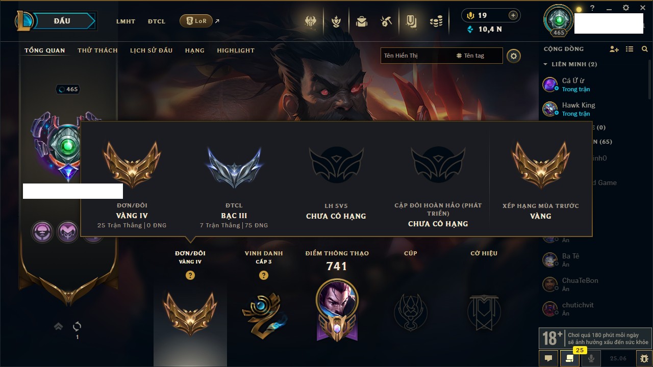 Rank Đơn: Vàng IKhung: BạcTướng: 171 - Còn 60584 THXTrang Phục: 286Rank ĐTCL: Vàng IIILinh Thú: 117