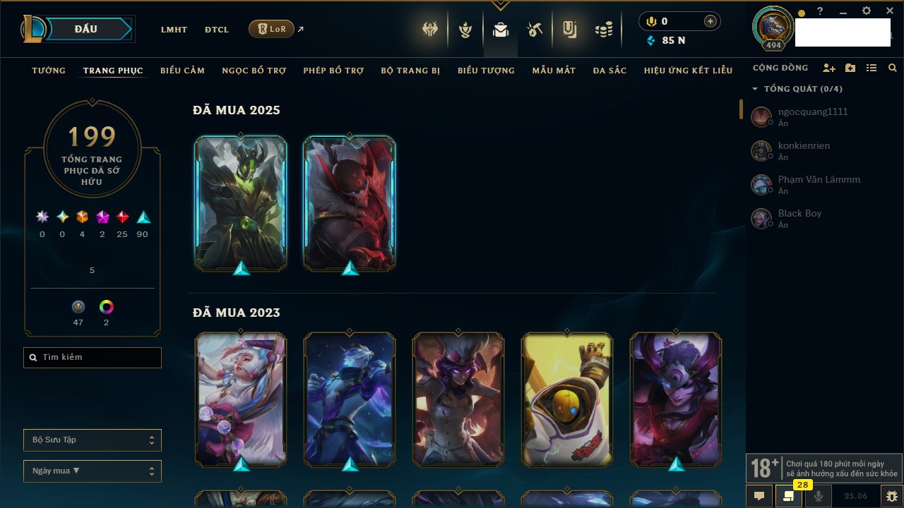 Rank Đơn: Chưa Rank Khung: Vàng Tướng: 171 - Còn 140250 THX Trang Phục: 80 Rank ĐTCL: Chưa Rank Linh Thú: 68
