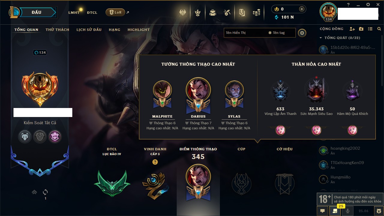 Rank Đơn: Bạch Kim IVKhung: Bạch kimTướng: 171 - Còn 154285 THXTrang Phục: 169Rank ĐTCL: Bạch Kim IILinh Thú: 60
