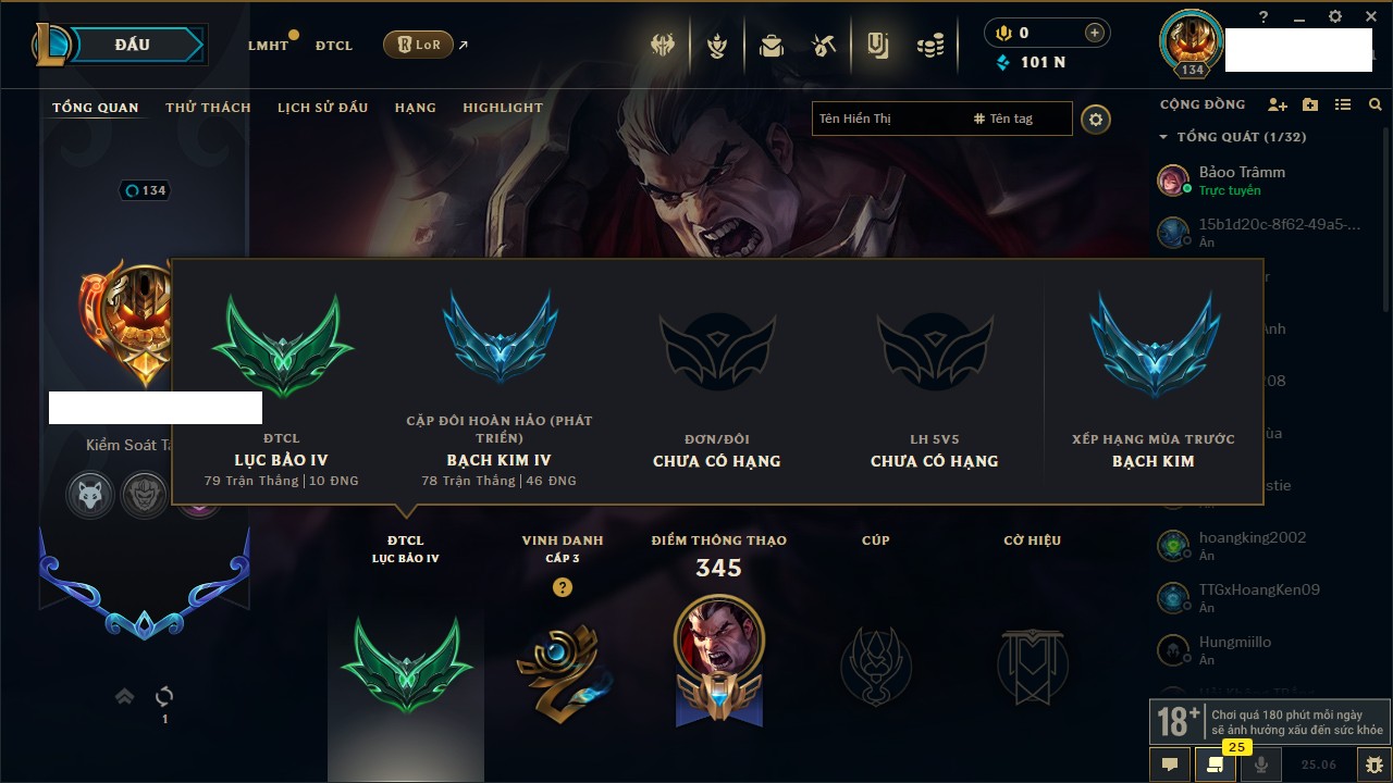 Rank Đơn: Bạc IIKhung: VàngTướng: 171 - Còn 332462 THXTrang Phục: 165Rank ĐTCL: Kim Cương IVLinh Thú: 181