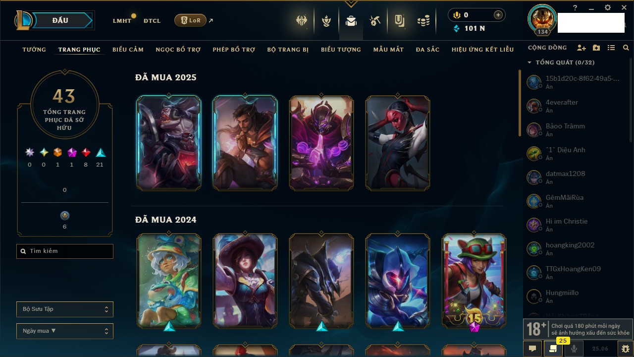 Rank Đơn: Vàng IVKhung: VàngTướng: 171 - Còn 48721 THXTrang Phục: 171Rank ĐTCL: Chưa RankLinh Thú: 27