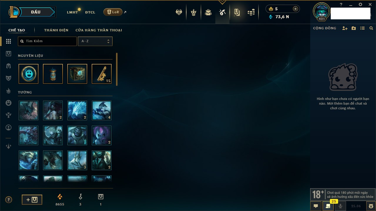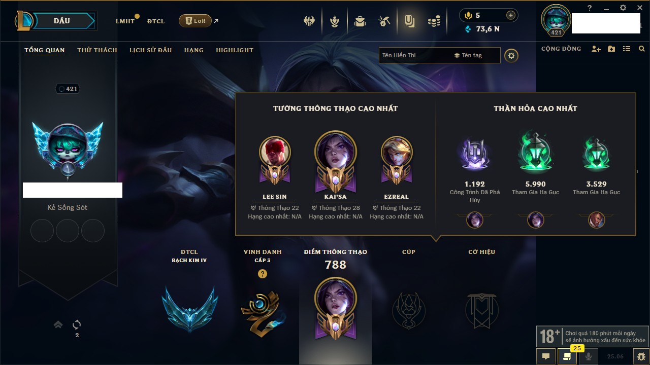 Rank Đơn: Vàng IKhung: VàngTướng: 155 - Còn 18217 THXTrang Phục: 63Rank ĐTCL: Chưa RankLinh Thú: 49