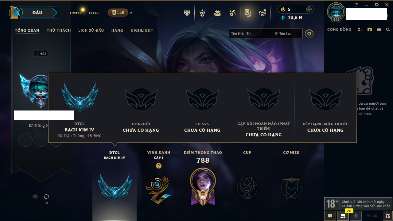 Rank Đơn: Bạch Kim IIIKhung: ĐồngTướng: 172 - Còn 83069 THXTrang Phục: 43Rank ĐTCL: Chưa RankLinh Thú: 90