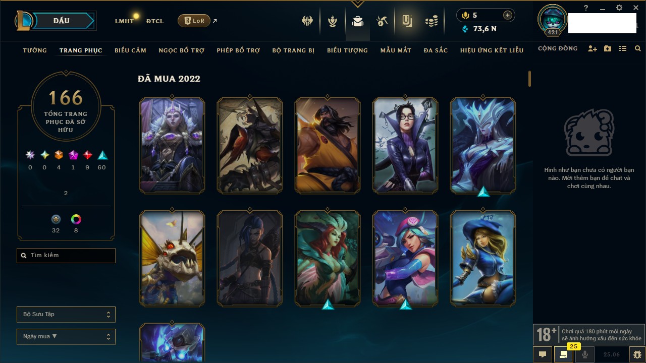 Rank Đơn: Chưa RankKhung: Chưa có khungTướng: 122 - Còn 5282 THXTrang Phục: 71Rank ĐTCL: Chưa RankLinh Thú: 39