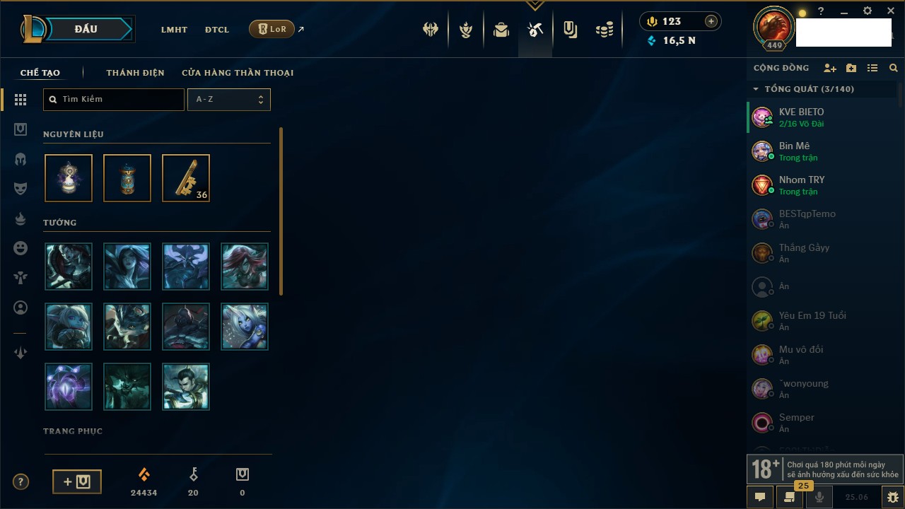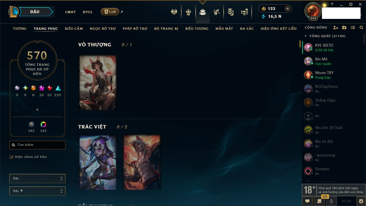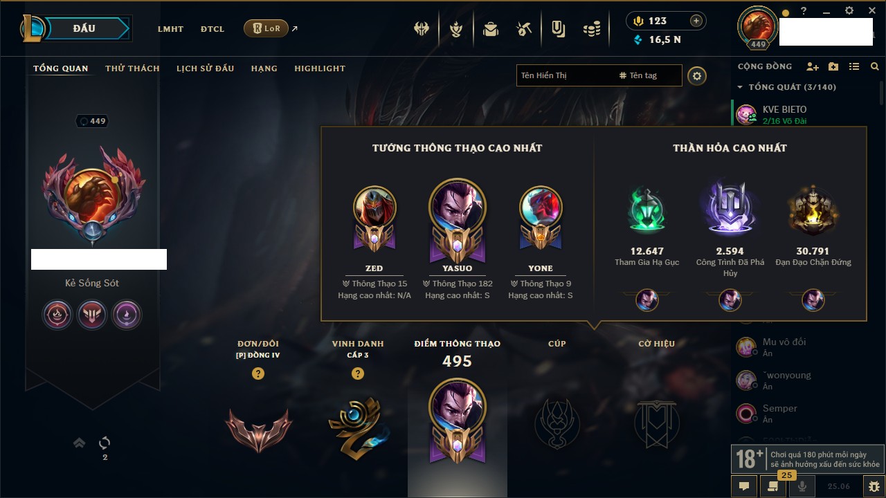 Rank Đơn: Bạch Kim III Khung: Bạch kim Tướng: 172 - Còn 76349 THX Trang Phục: 583 Rank ĐTCL: Chưa Rank Linh Thú: 278