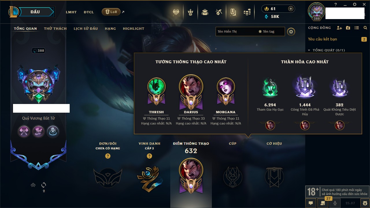 Rank Đơn: Bạc IKhung: Bạch kimTướng: 86 - Còn 1608 THXTrang Phục: 47Rank ĐTCL: Chưa RankLinh Thú: 58