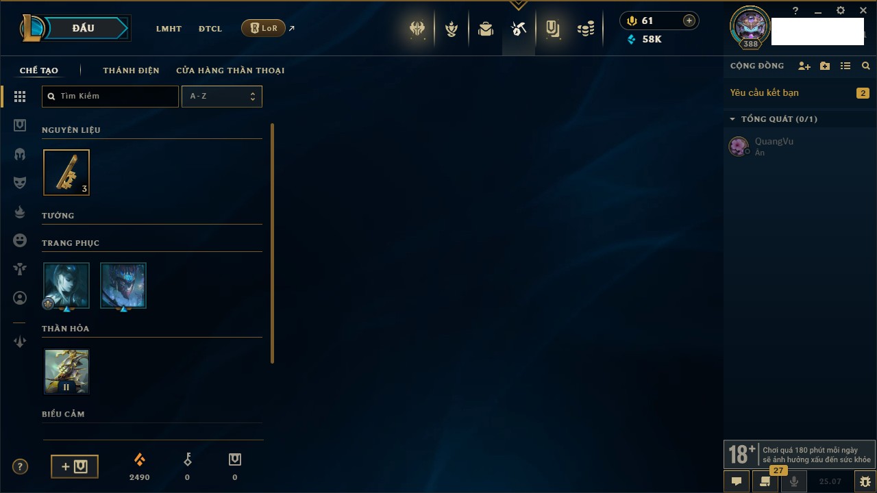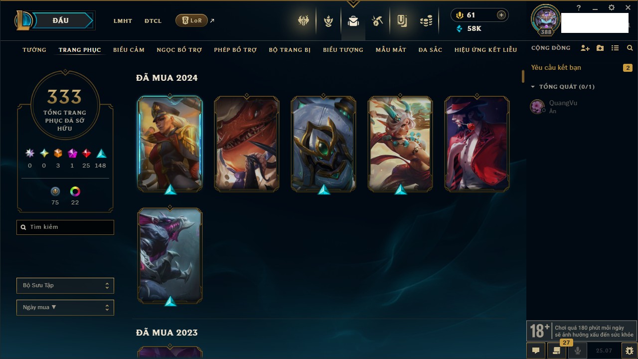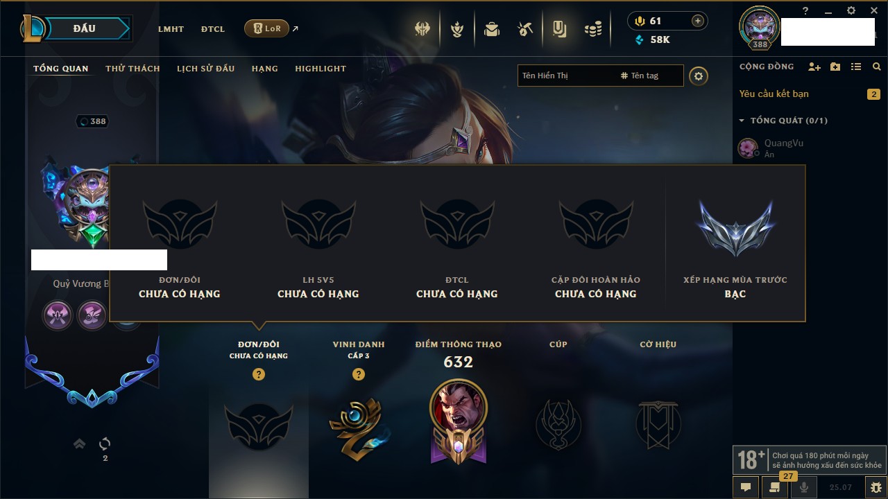 Rank Đơn: Bạc IIIKhung: BạcTướng: 170 - Còn 76760 THXTrang Phục: 235Rank ĐTCL: Chưa RankLinh Thú: 183