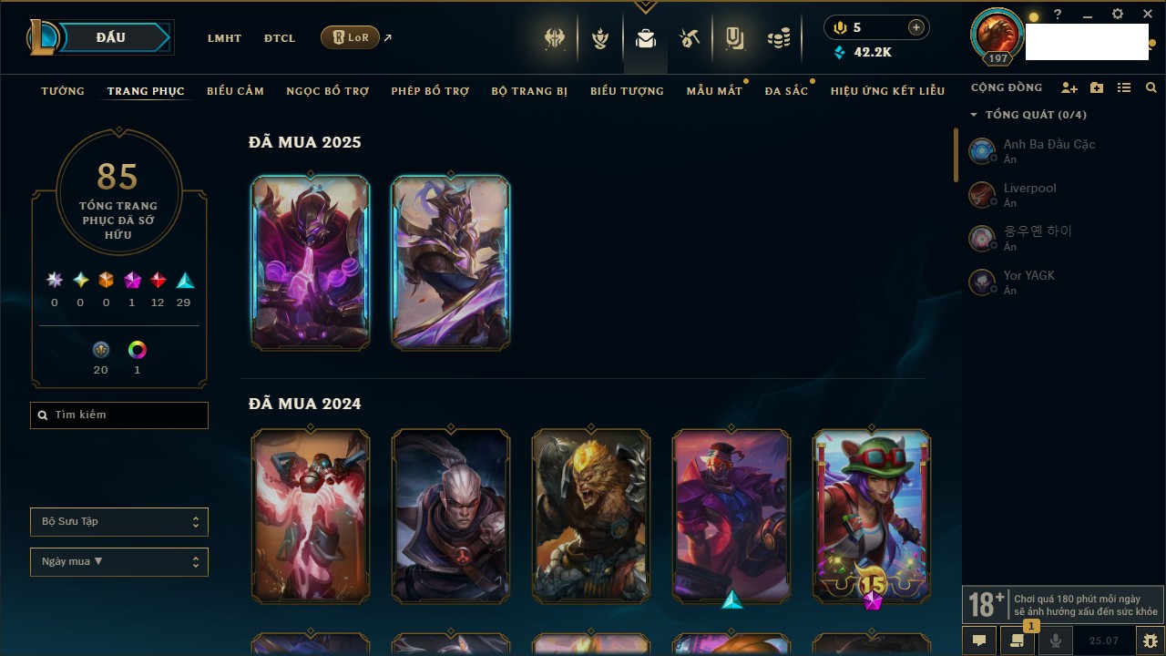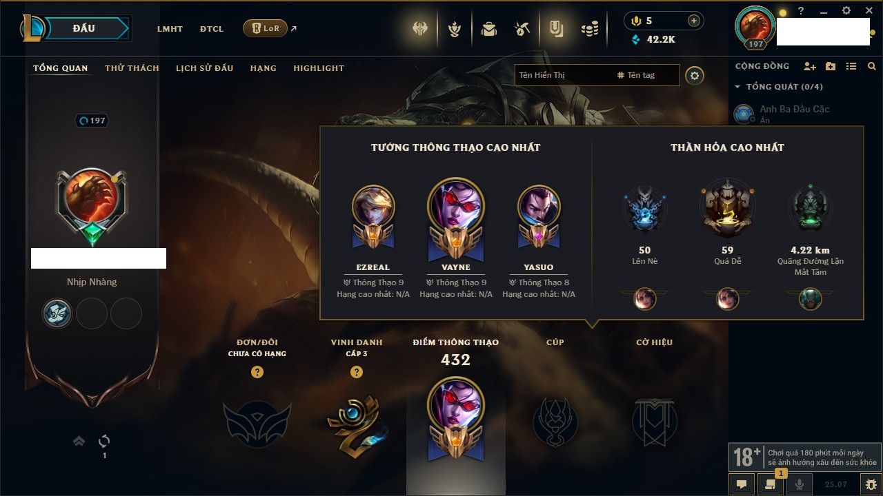 Rank Đơn: Bạch Kim IIIKhung: Bạch kimTướng: 59 - Còn 20316 THXTrang Phục: 29Rank ĐTCL: Chưa RankLinh Thú: 3