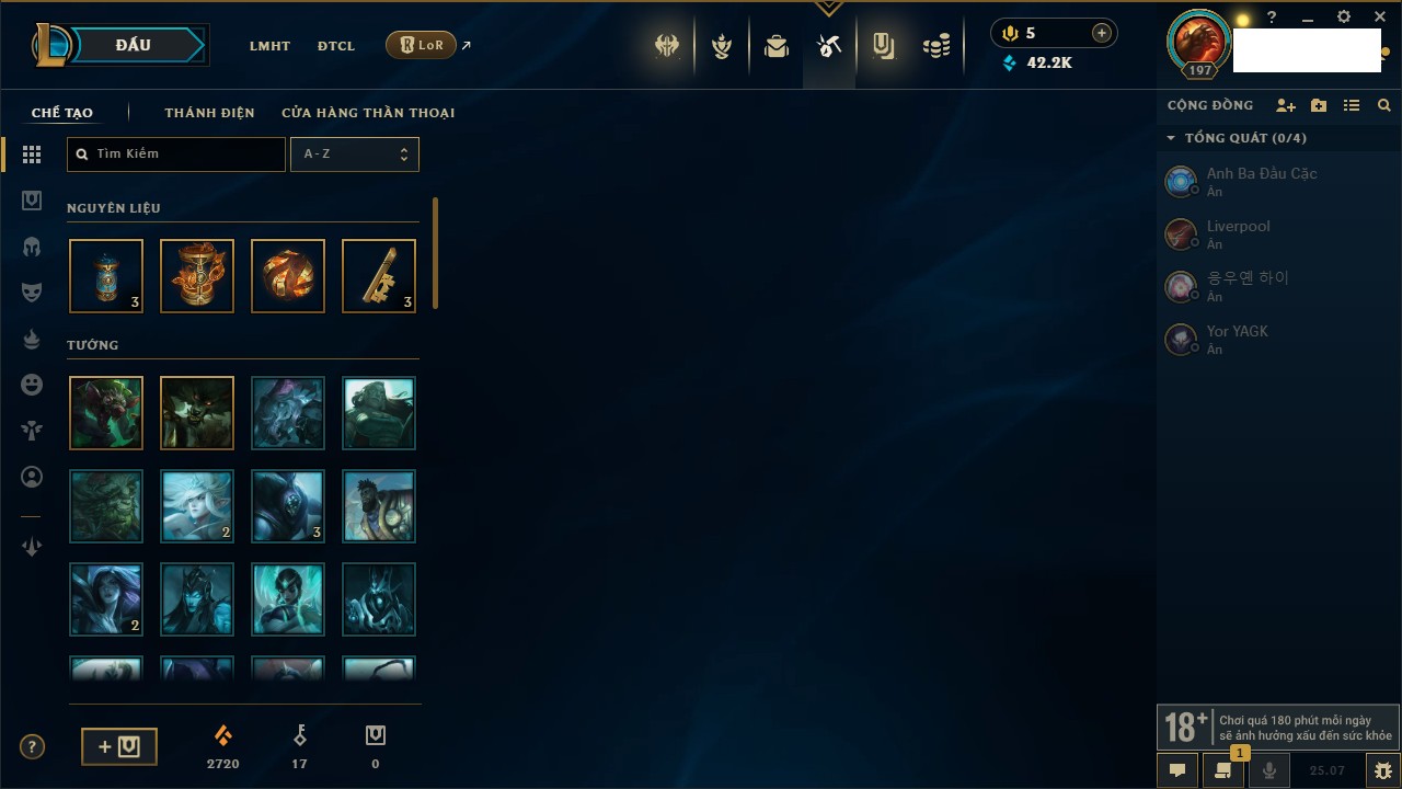 Rank Đơn: Vàng IKhung: Chưa có khungTướng: 168 - Còn 2976 THXTrang Phục: 154Rank ĐTCL: Chưa RankLinh Thú: 81
