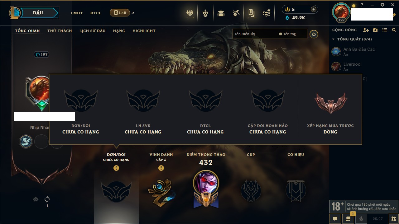 Rank Đơn: Chưa RankKhung: Chưa có khungTướng: 162 - Còn 12067 THXTrang Phục: 175Rank ĐTCL: Chưa RankLinh Thú: 22