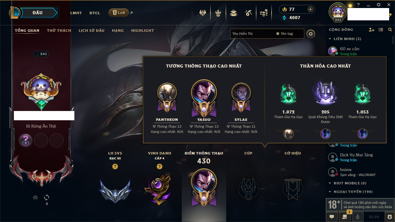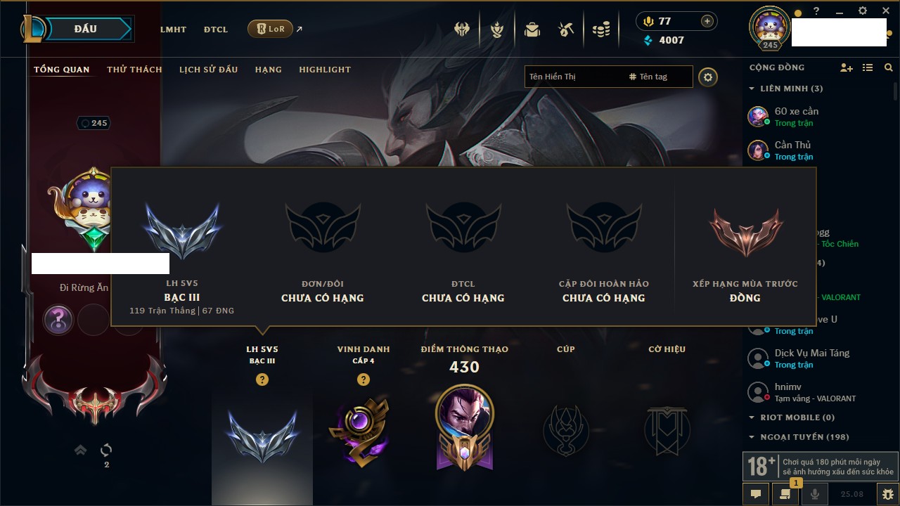 Rank Đơn: Bạch Kim IIIKhung: Bạch kimTướng: 171 - Còn 136108 THXTrang Phục: 261Rank ĐTCL: Bạc IVLinh Thú: 73