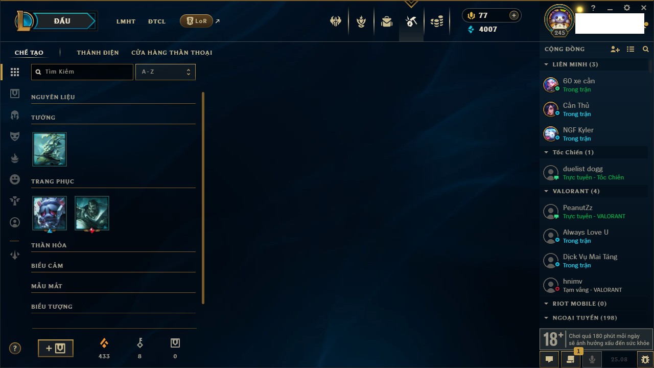 Rank Đơn: Lục Bảo IVKhung: VàngTướng: 171 - Còn 154648 THXTrang Phục: 203Rank ĐTCL: Bạch Kim IVLinh Thú: 69